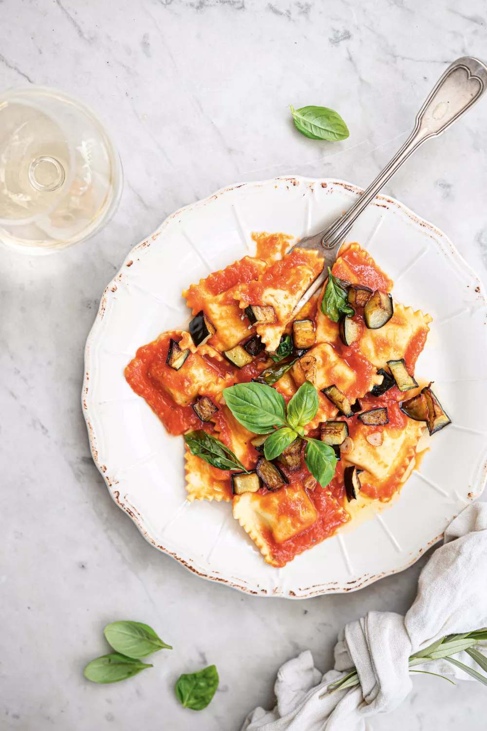 Huisgemaakte ravioli gevuld met zachte aubergine en knapperig boerenbrood, geserveerd met een zoete, geurige tomatensaus. Het deeg rol je met de hand of door de pastamachine, de aubergine bak je goudbruin en de kerstomaatjes laat je rustig pruttelen tot een volle saus, ideaal voor een zomers diner of een gezellig weekendmaal. Met 00 bloem, balsamico en vegan Parmezaan zet je zo een verrassend plantaardige, hartige maaltijd op tafel.