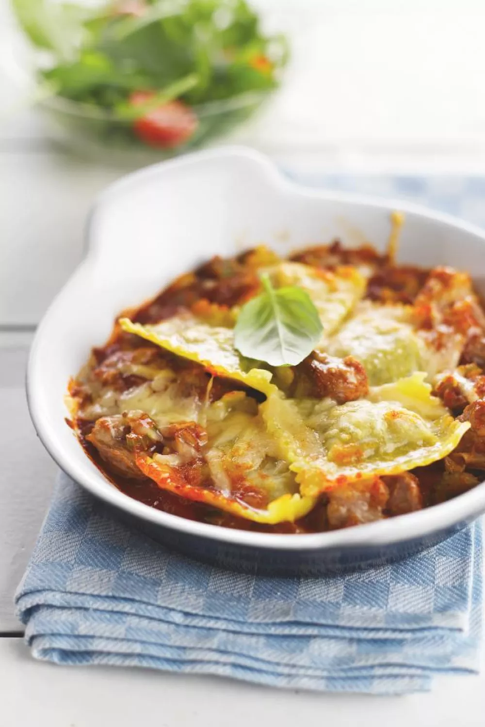 Kook ze heel kort in een grote hoeveelheid gezouten water. Giet de saus in een gratineerschotel. Leg er de gekookte ravioli in. Bestrooi rijkelijk met Parmezaanse kaas. Zet 20 minuten in de oven op 175 °C.