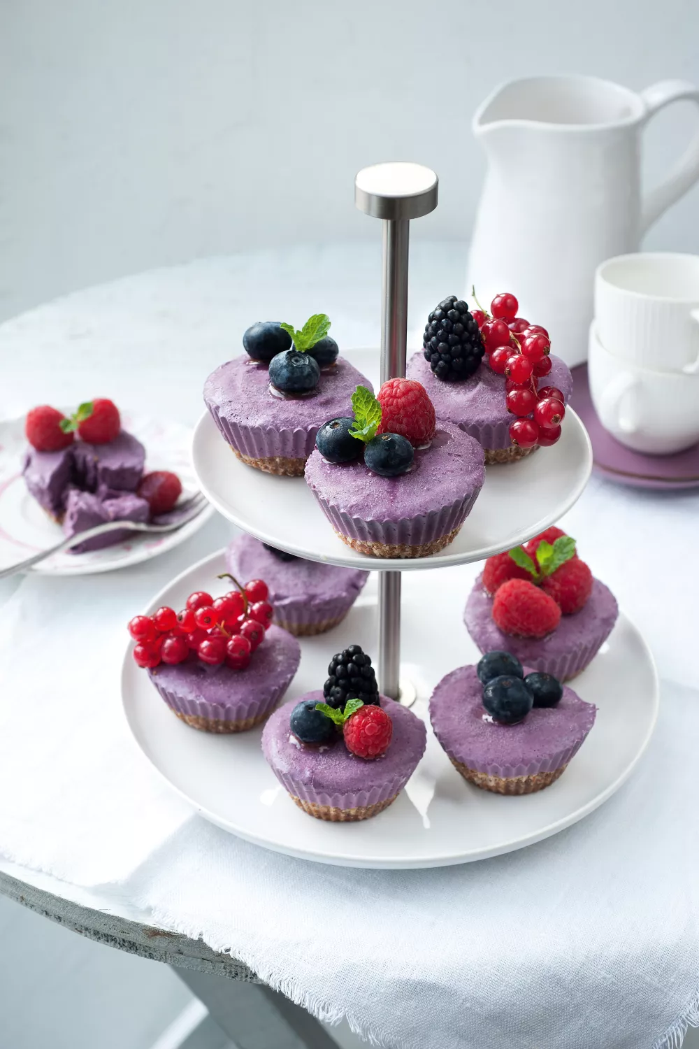 Plaats de taartjes een nachtje in de vriezer alvorens ze te serveren. Werk af met rood fruit.