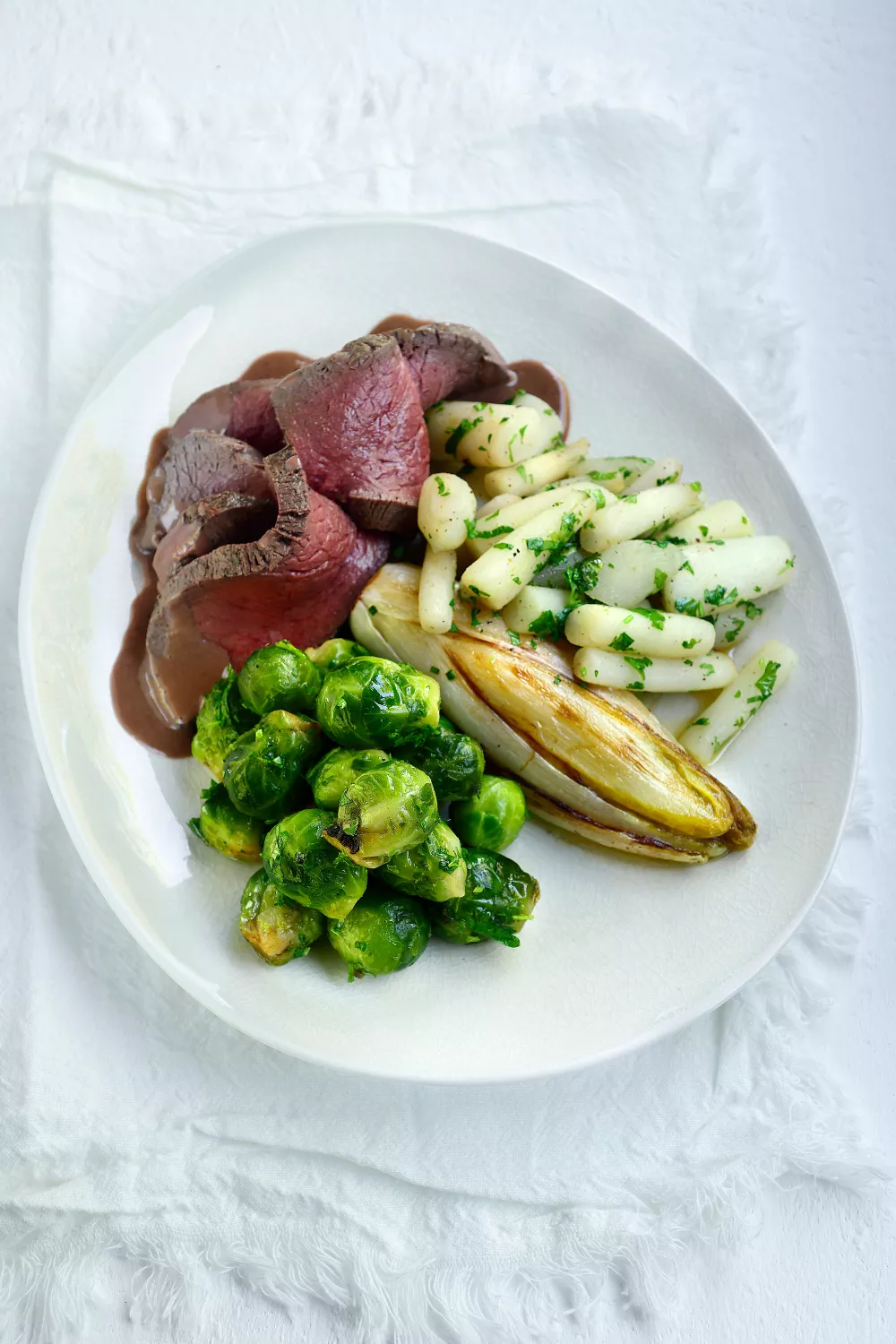 Dit reebilgebraad met wintergroentjes brengt het zachte, volle karakter van wild samen met geroosterde en gestoofde groenten zoals schorseneren, spruitjes en witloof. Het recept combineert klassiek aanbraden en een korte braadtijd in de oven met een rijke roomsaus van braadsappen en reebeenderen. Perfect voor een feestelijk herfst of winterdiner, te serveren met kroketjes, puree of gebakken aardappelen.