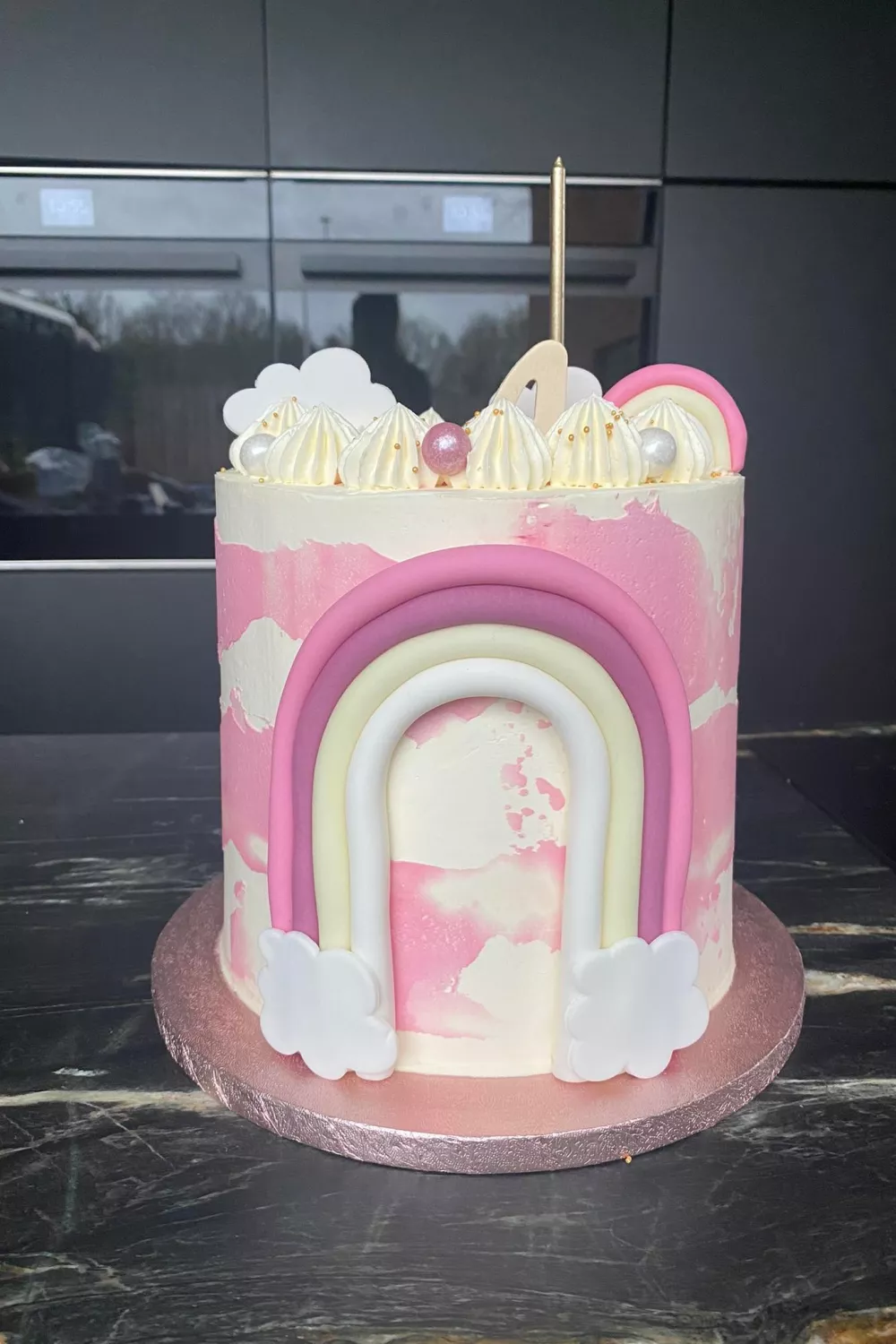 Neem de regenboog en plaats deze tegen de zijde van de taart. Druk lichtjes aan zodat deze blijft plakken aan de botercreme.Neem wat water en een penseeltje en lijm de wolkjes aan de uiteindes van de regenboog.Werk de taart verder af naar wens