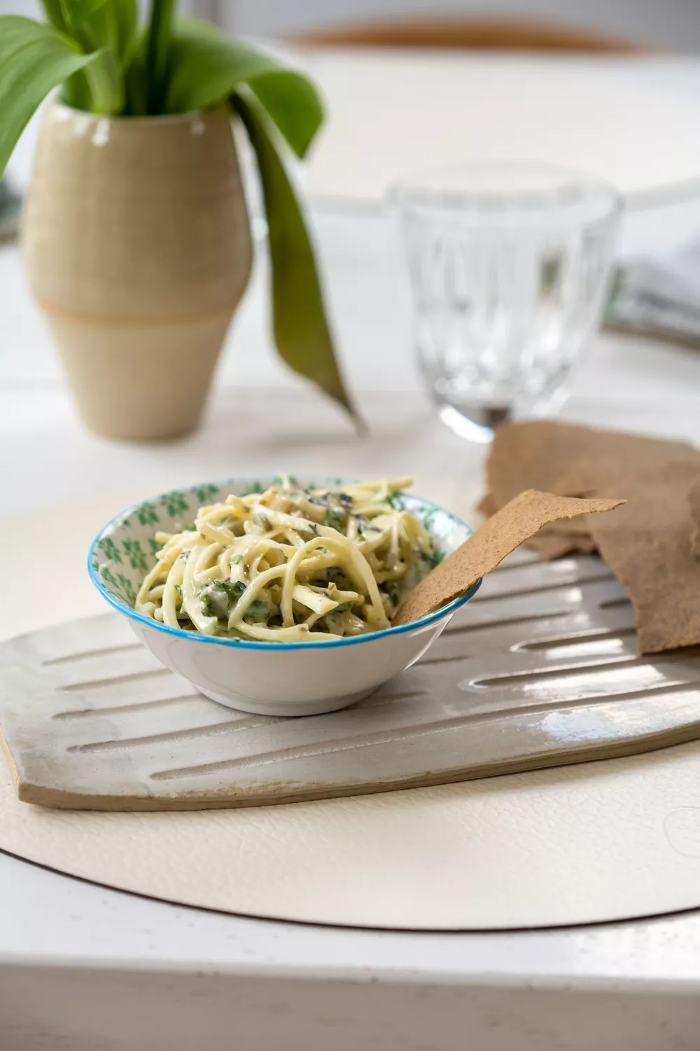 Meng de julienne van pastinaak met enkele lepeltjes van de mayonaise (naar smaak), de kappertjes, de augurk en de groene kruiden.