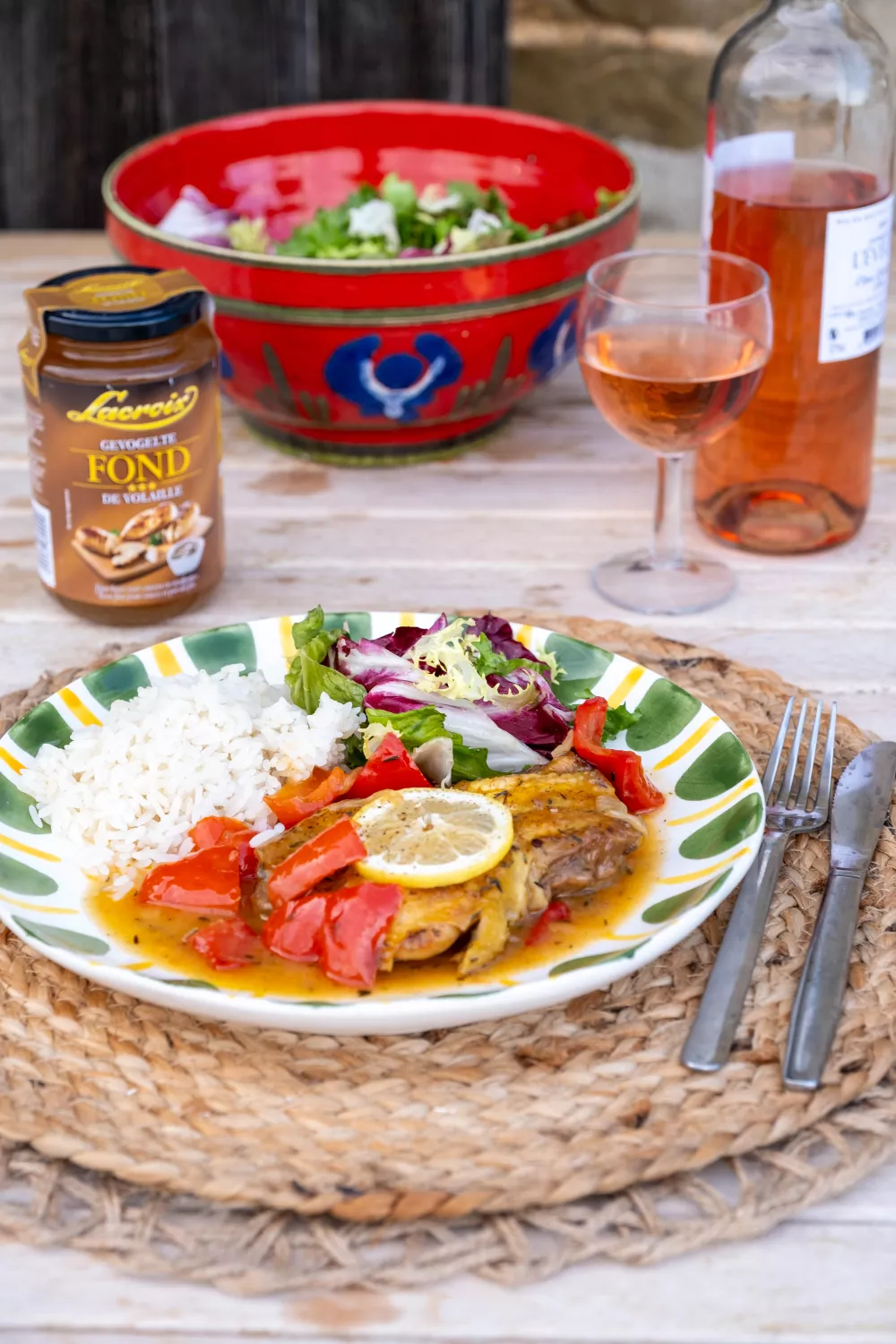 Rijk en kleurrijk rijstgerecht met sappige kippendijen en geroosterde paprika in een licht zoetzure abrikozen mosterdsaus. De kip wordt eerst goudbruin gebakken en vervolgens zachtjes in de saus gestoofd tot een glanzende, ingedikte jus met citroen en tijm. Perfect als hartig doordeweeks familie- of zomergerecht, geserveerd met rijst en een frisse citroensla.