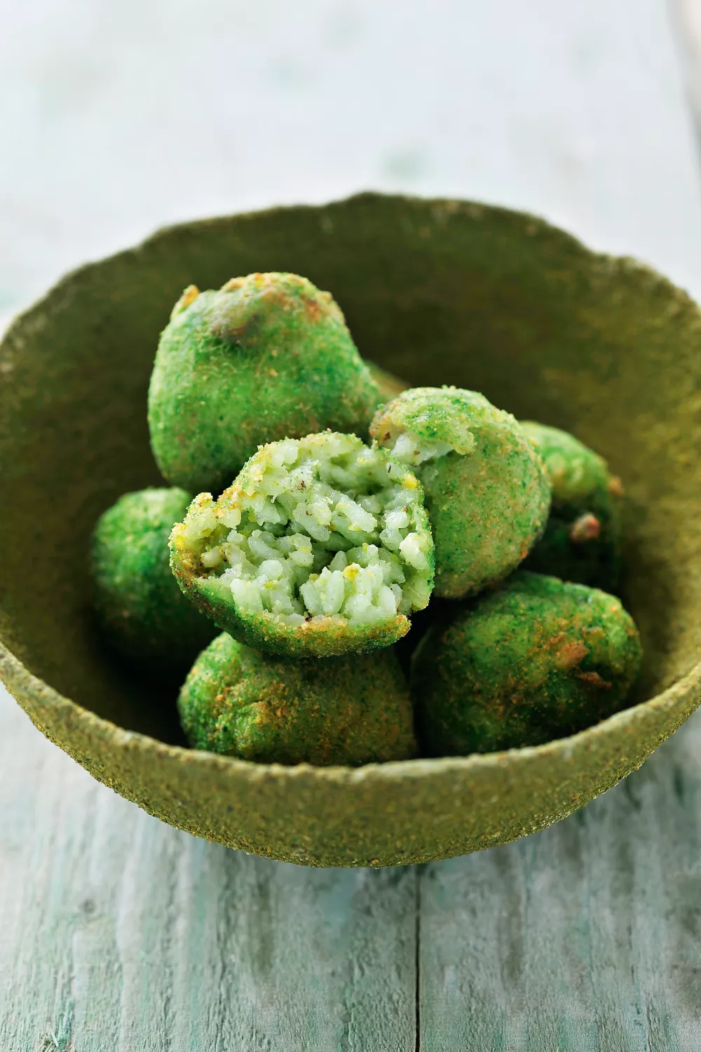 Smeer de risotto uit op een werkblad en laat een uur tot anderhalf uur rusten. Zodra de risotto koud is, maak je rijstballetjes. Rol balletjes in je handpalm. Paneer de rijstballetjes. Hiervoor gebruiken we een mengsel van pistache en paneermeel. Frituur de balletjes in voorverwarmde arachideolie op 170 graden gedurende 8 minuten.