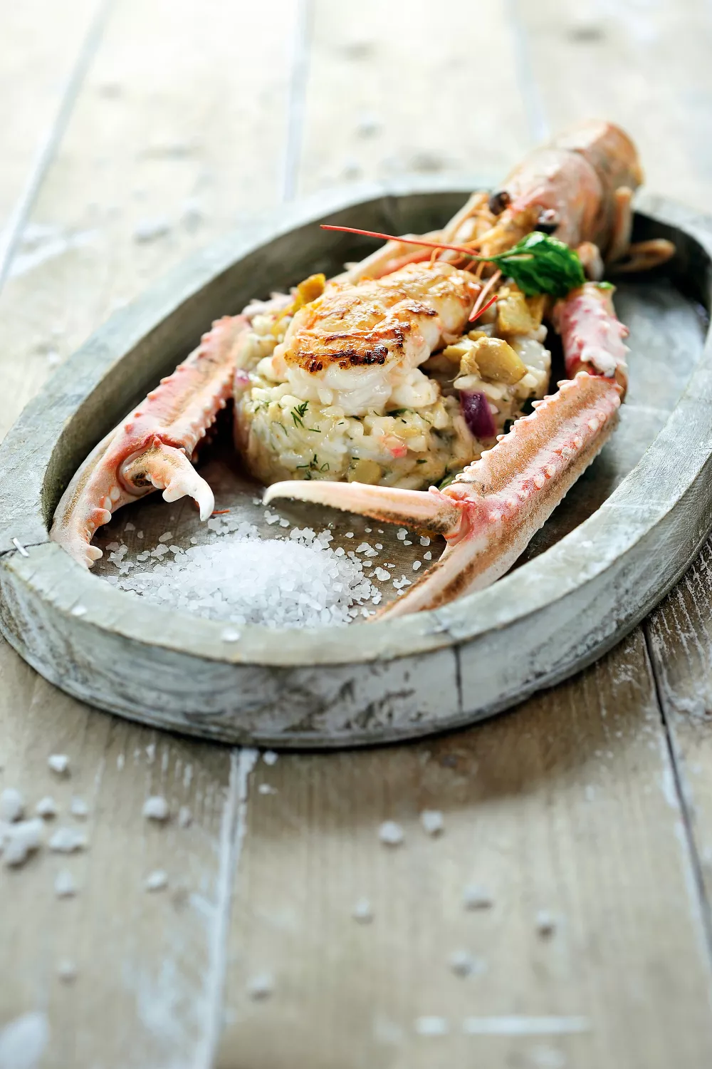 Doe de risotto op een bord en leg er de langoustine op. Als decoratie kun je nog artisjokken krokant bakken in de resterende olijfolie.