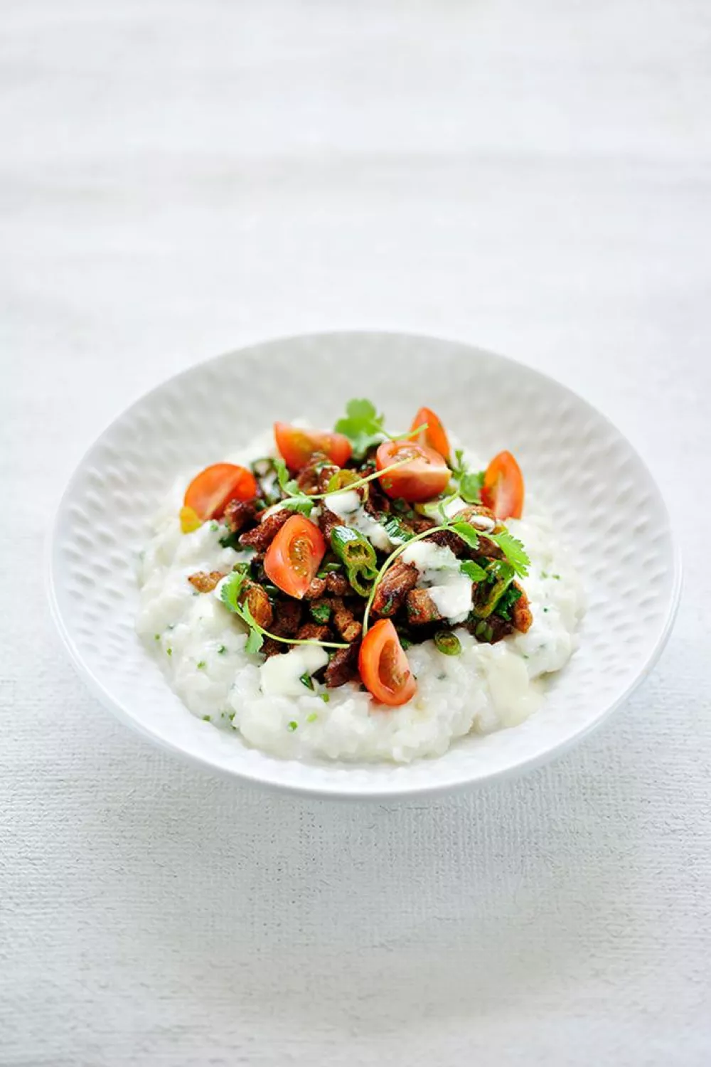 Romige risotto met pitavlees brengt zachte Arborio rijst samen met een frisse yoghurt en look dressing voor een hartig maar licht contrast. De rijst wordt langzaam gegaard in groentebouillon met sjalot voor een fluweelachtige textuur, terwijl het pitavlees in een aparte pan knapperig wordt gebakken en met koriander bestrooid. Afgewerkt met een lichte citroenmayonaise en zoete kerstomaatjes is dit gerecht perfect voor een gezellige doordeweekse maaltijd of een zomers etentje.
