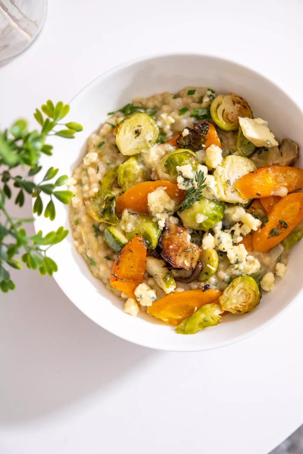 Risotto van parelcouscous met wintergroentjes en blauwe kaas