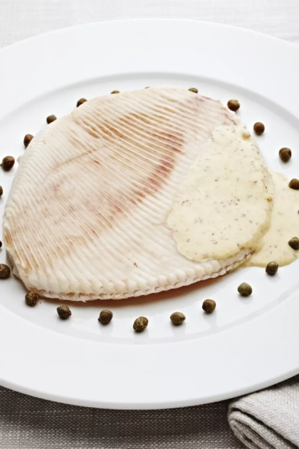 Haal de rog uit het pocheervocht en serveer met de mosterd-kappertjes saus en wat grof gemalen zeezout.