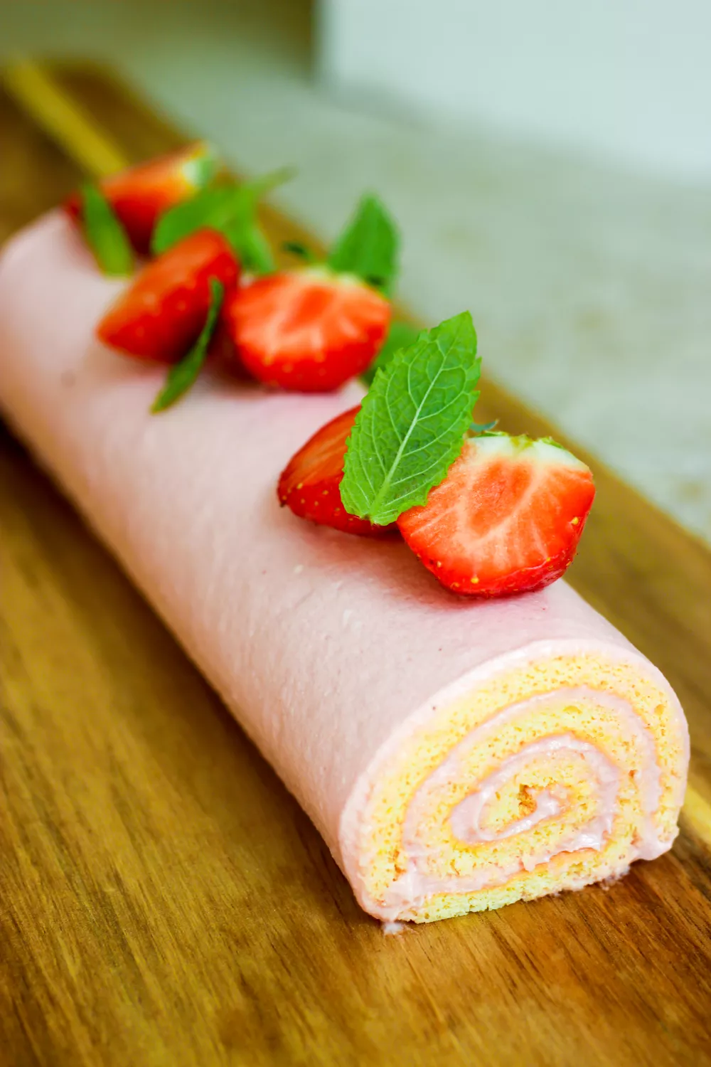Werk de rolbiscuit af met verse aardbeien en blaadjes munt.
