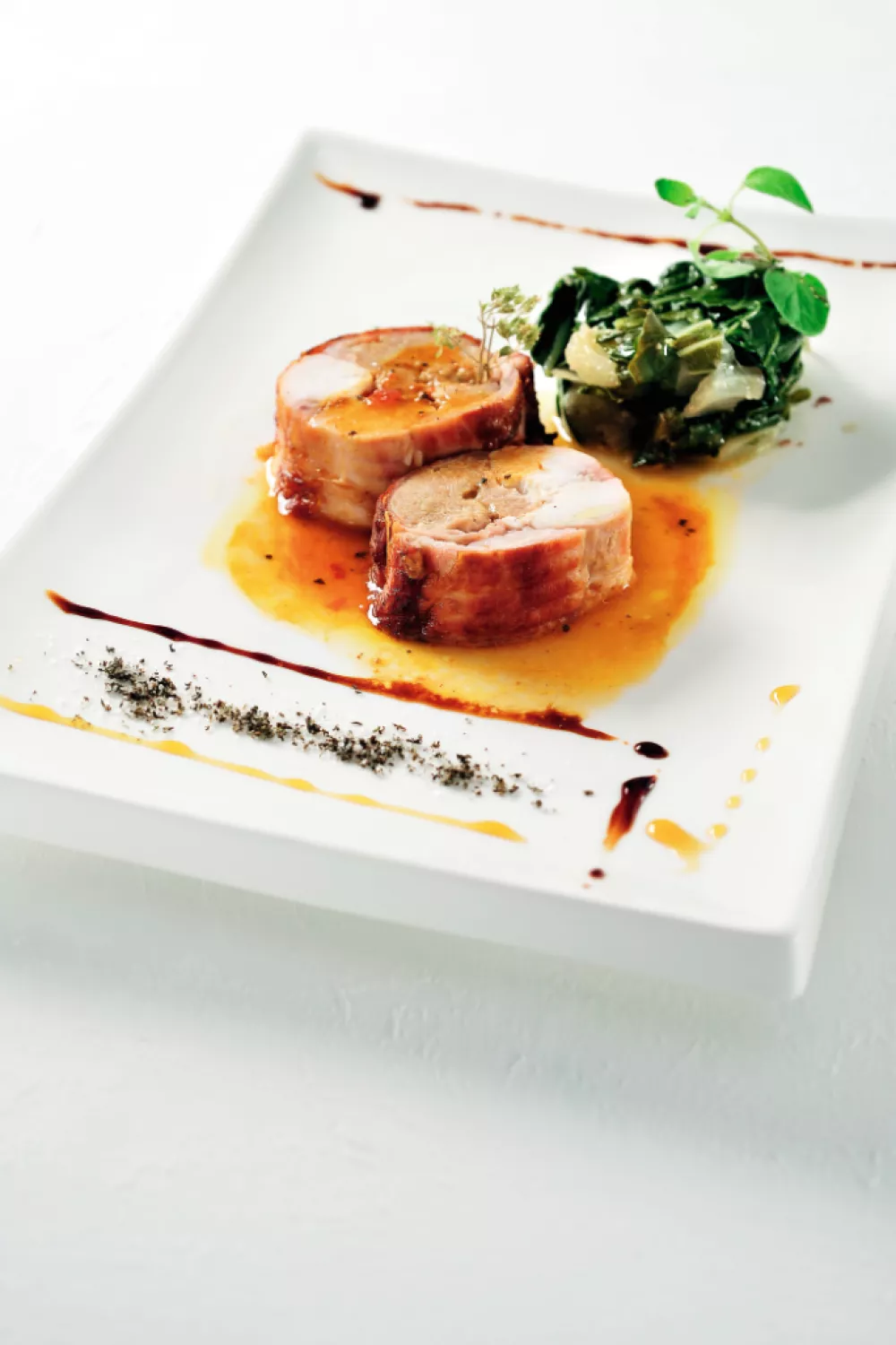 Leg per bord 3 plakjes rollade en schep 2 el snijbiet in een dresseer ring. Verwijder voorzichtig de dresseer ring en lepel wat saus over de rollade. Werk af met een scheutje olijfolie, een snuifje peper en een takje verse rozemarijn.