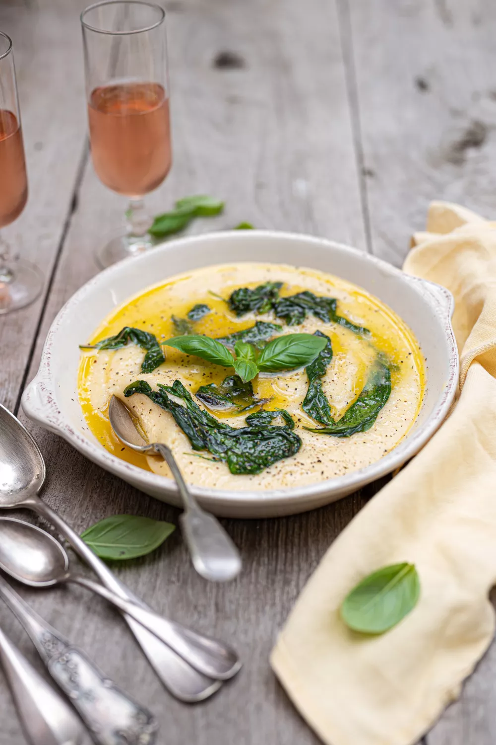 Romige knoflookpolenta met basilicumboter combineert fluweelzachte polenta met zoete, geroosterde knoflook en fris aromatische basilicum. De knoflook wordt langzaam in de oven geroosterd en door de polenta gemengd, waarna geraspte plantaardige parmezaan en gesmolten plantaardige boter zorgen voor een hartige, volledig vegan smaak. Heerlijk als troostrijk bijgerecht bij herfstige diners of als smaakvol hoofdgerecht bij informele etentjes.