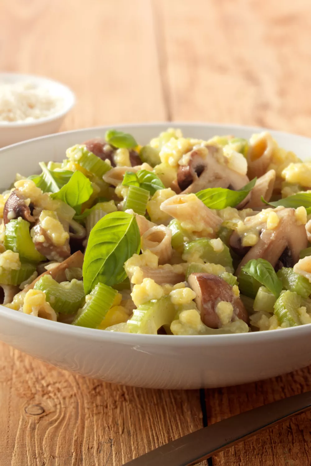Romige volkorenpenne met bleekselder en kastanjechampignons zet een warme, hartige smaak neer dankzij ei en geraspte Parmezaan, met een frisse toets van fijngehakte basilicum. De ui en selder worden zacht gefruit en de champignons bruingebakken voordat alles door de pasta wordt geroerd, wat zorgt voor een snelle, voedzame bereiding met diepe umami-smaken. Perfect voor een makkelijk doordeweeks diner of een lichte lunch in lente en herfst, en eenvoudig te variëren met aardappelpuree.