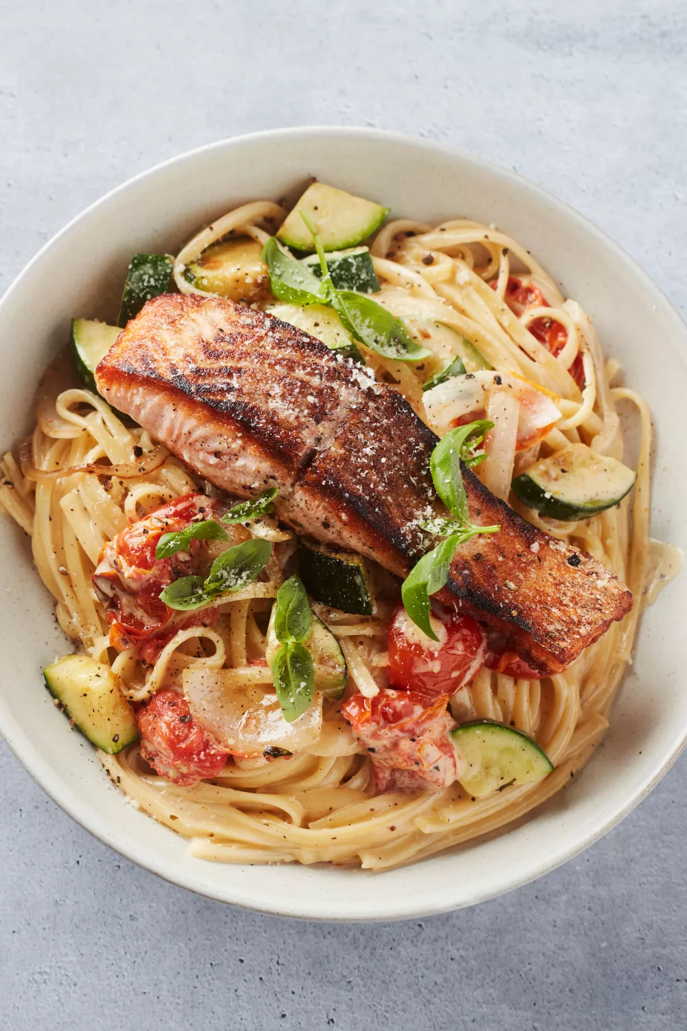 Romige pasta met zalm en geroosterde kerstomaatjes combineert fluweelzachte roomsaus, frisse courgette en hartige Parmezaan tot een smaakvol en makkelijk bord. De kerstomaatjes roosteren in de oven brengt hun zoetheid naar voren, terwijl de zalm kort wordt aangebakken voor een krokant vel en sappig binnenste. Perfect als zonnig zomers diner of feestelijk doordeweeks maal, afgemaakt met verse basilicum voor een aromatische toets.