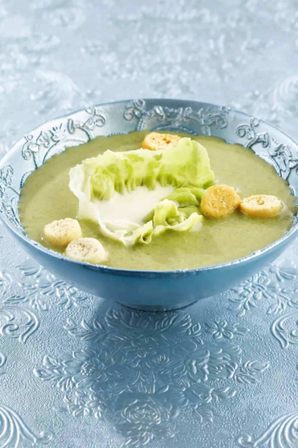 Breng aan de kook en doe de sla erbij. Dek af en laat 20 minuten verder koken. Mix de soep fijn en breng op smaak met peper en zout.