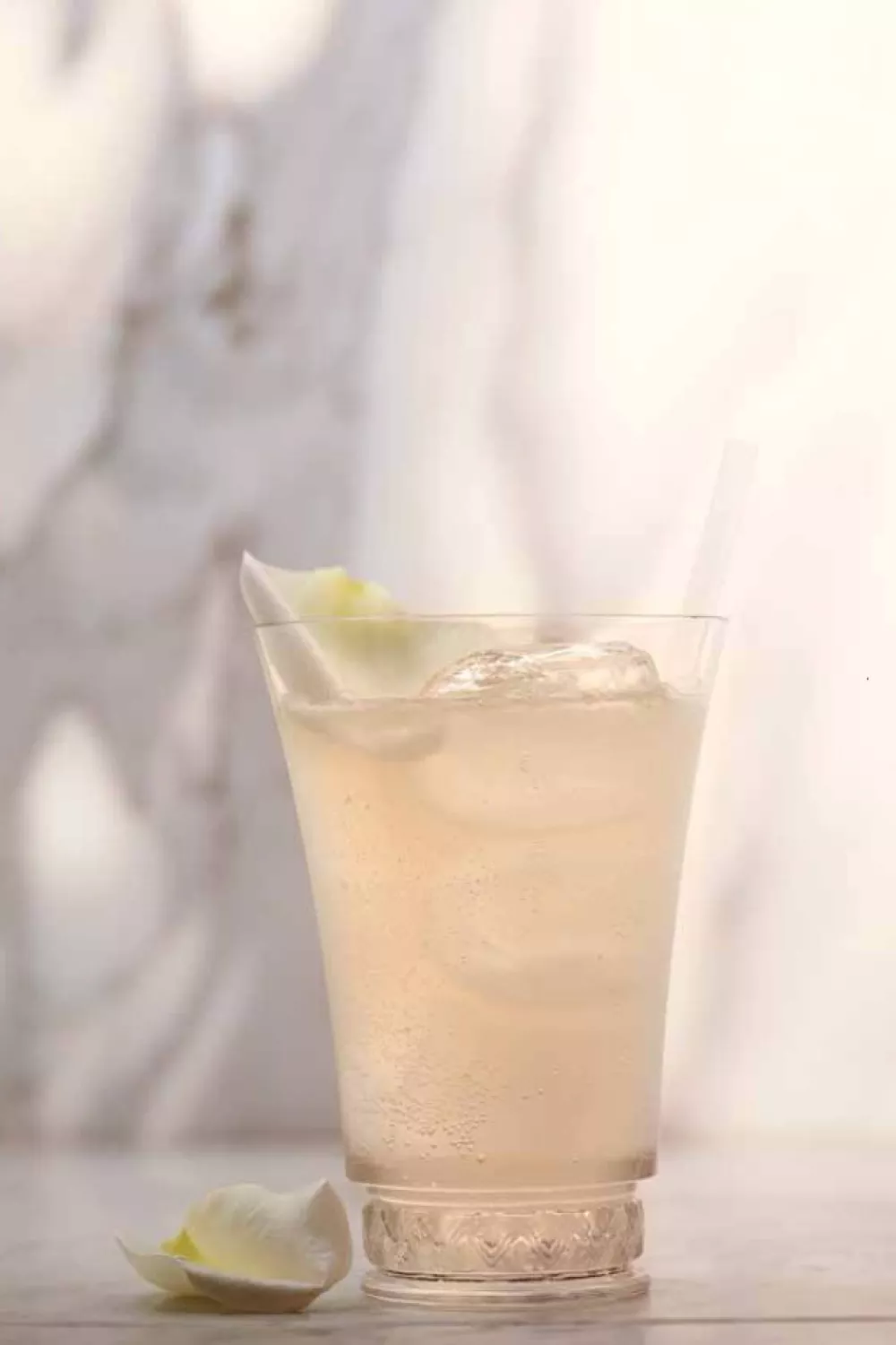 Zeef de Rose Fizz in een met ijsblokjes gevuld collinsglas. Vul op met Fentimans Rose Lemonade.