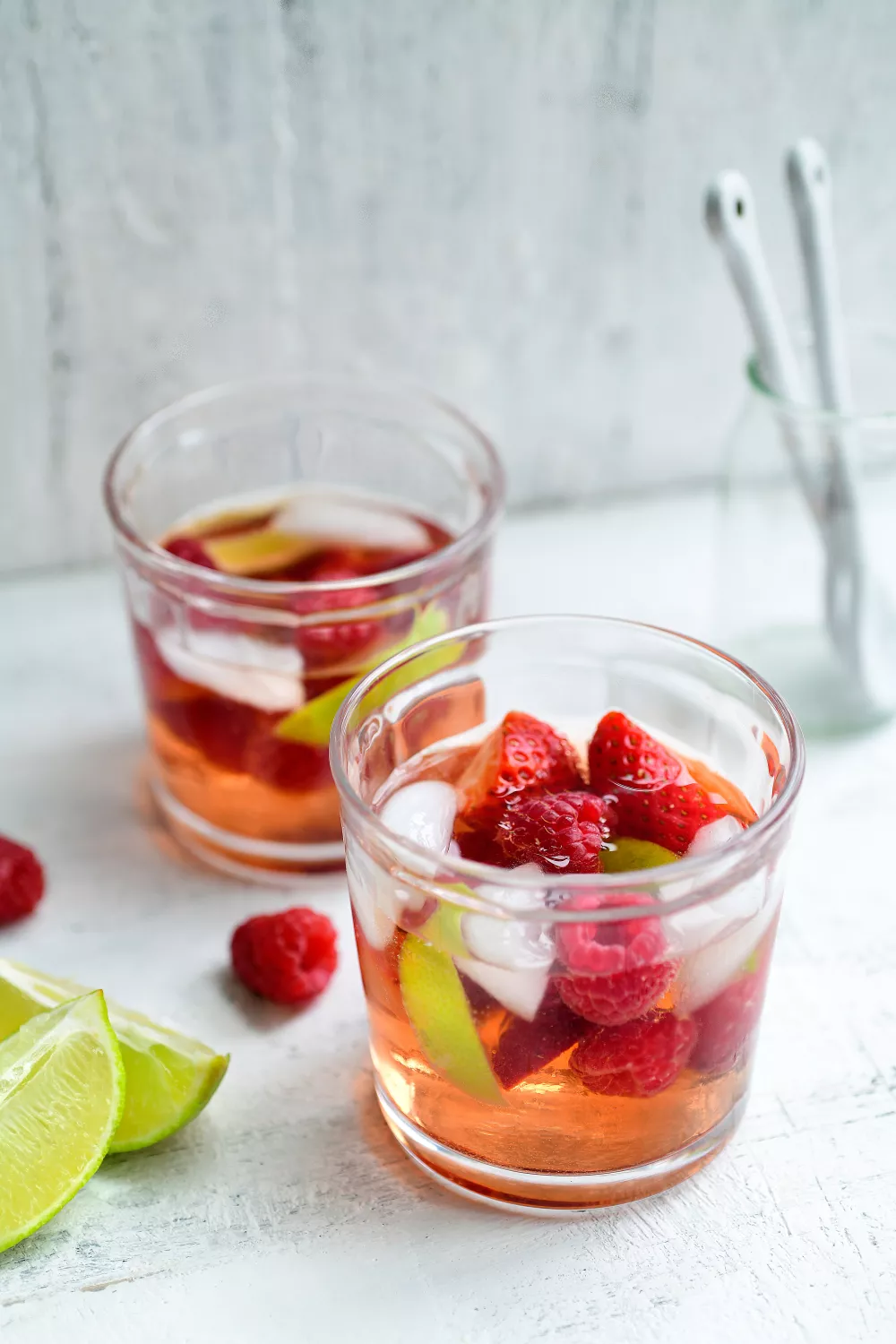 Deze frisse rosé sangria met aardbeien en frambozen brengt roséwijn samen met sinaasappellikeur en een scheut limoensap tot een fruitige, lichtzoete cocktail ideaal voor warme zomerdagen en terrasmomenten. Laat de bessen en limoen een uur in de koelkast trekken zodat de smaken goed intrekken en werk af met ijsblokjes net voor het serveren voor maximale frisheid. Simpel van bereiding en perfect als borreldrank of zomers aperitief.