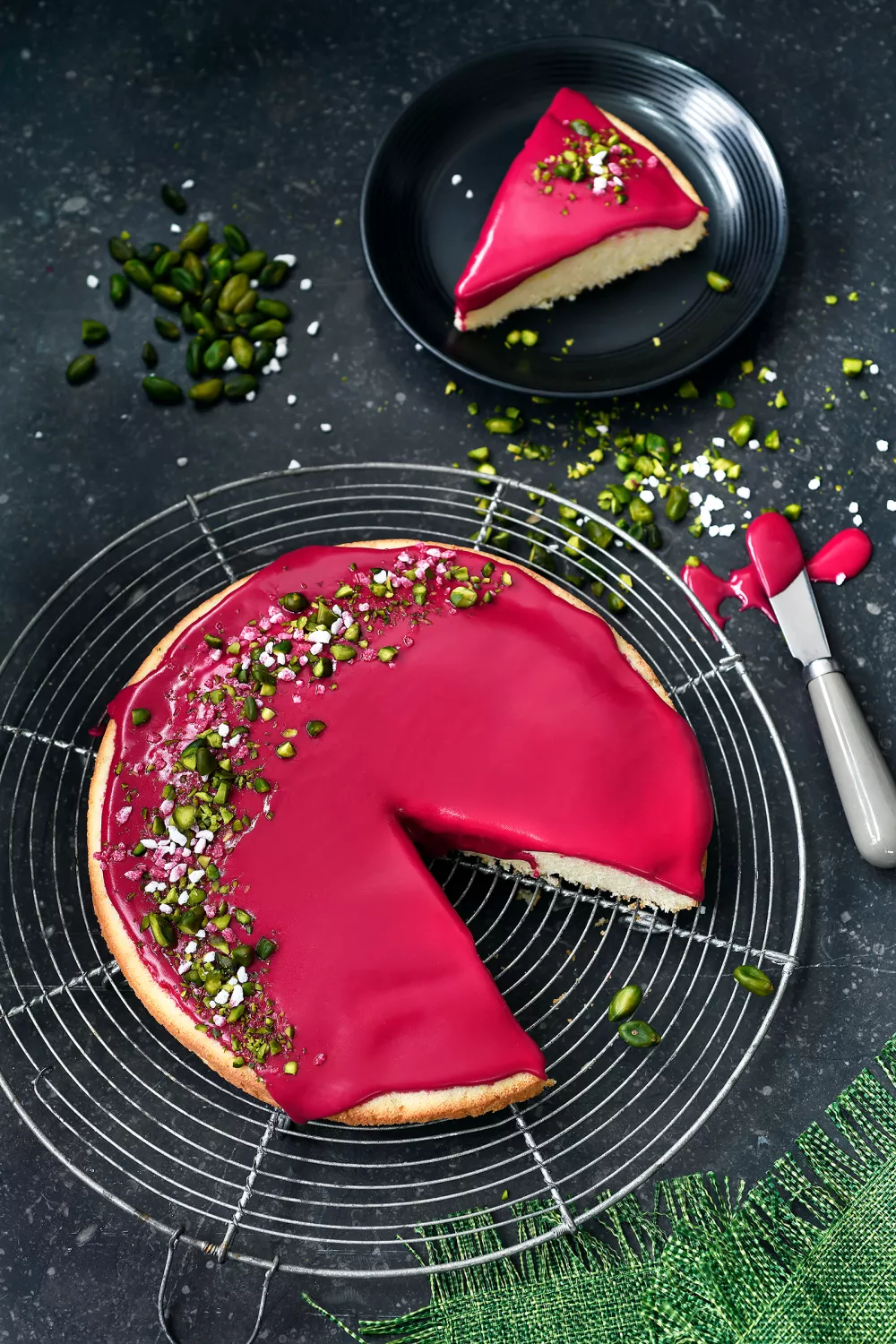 Een zachte, luchtige roze koek met boter, citroenzeste en vanille die perfect is voor een lente high tea of een vrolijk verjaardagsfeestje. Het simpele cakebeslag wordt egaal opgeklopt en in een lage springvorm gebakken zodat de koek mooi vlak en licht van kleur blijft. Afgewerkt met een roze glazuur van bloemsuiker en frambozencoulis en wat pistachenoten of suikerparels krijgt hij een feestelijk en fris contrast.