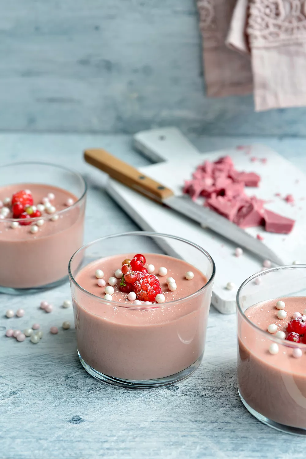 Luchtige ruby chocolademousse met romige slagroom en fris rood fruit, perfect als feestelijk dessert of zomerse afsluiter. De zijdezachte textuur ontstaat door gesmolten ruby chocolade te combineren met opgeklopte eidooiers, stijfgeklopte eiwitten en zachte room. Serveer in glaasjes en laat een nacht opstijven voor het beste resultaat, afwerken met rood fruit en eetbare pareltjes voor extra kleur en elegantie.