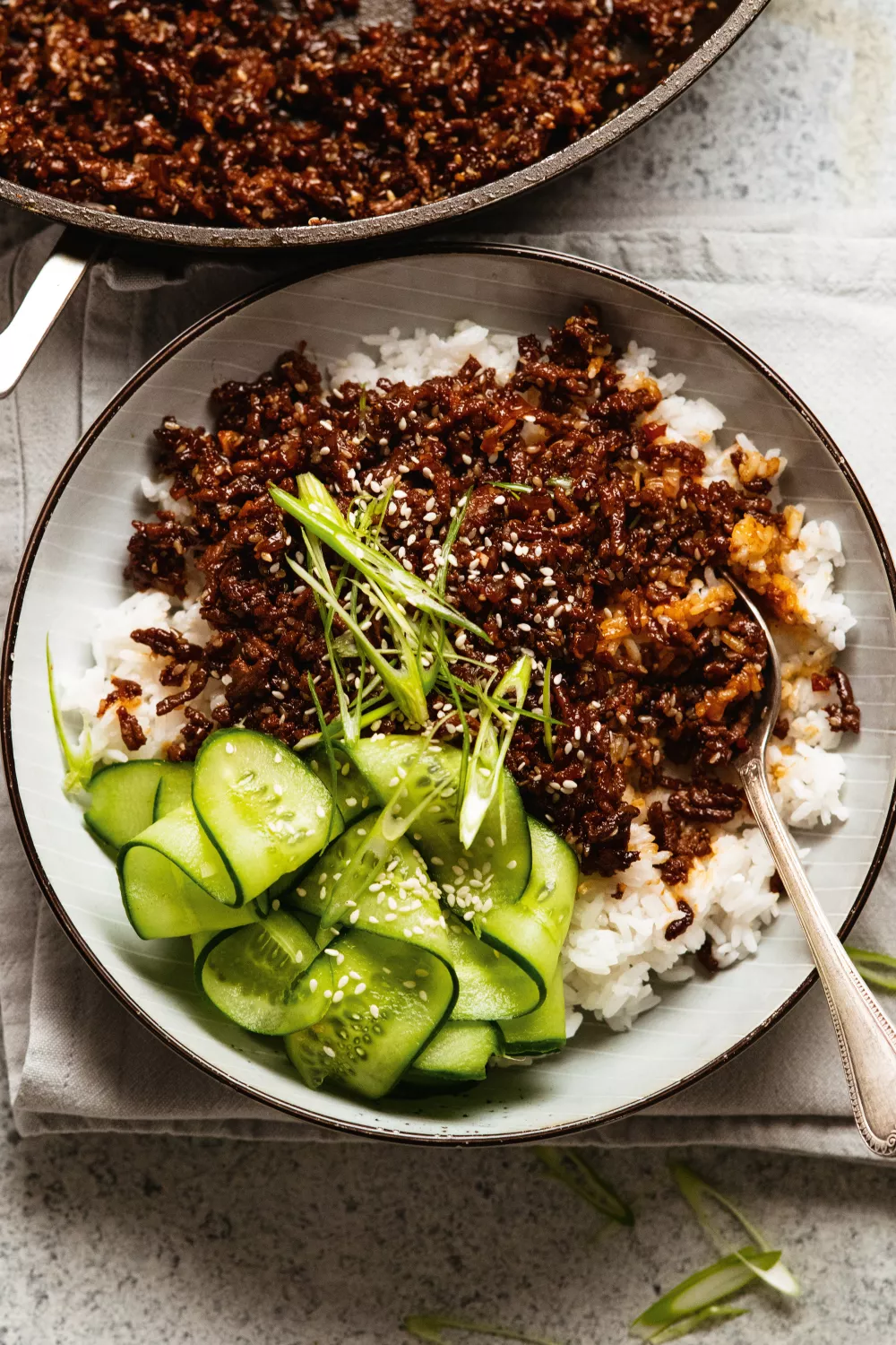 Voeg het water toe en blijf 30 seconden roeren; hierdoor wordt het gehakt nog smeuïger. Schep de gehaktsaus op rijst, garneer met sesamzaad en lente-ui, en geef er komkommerlinten bij.