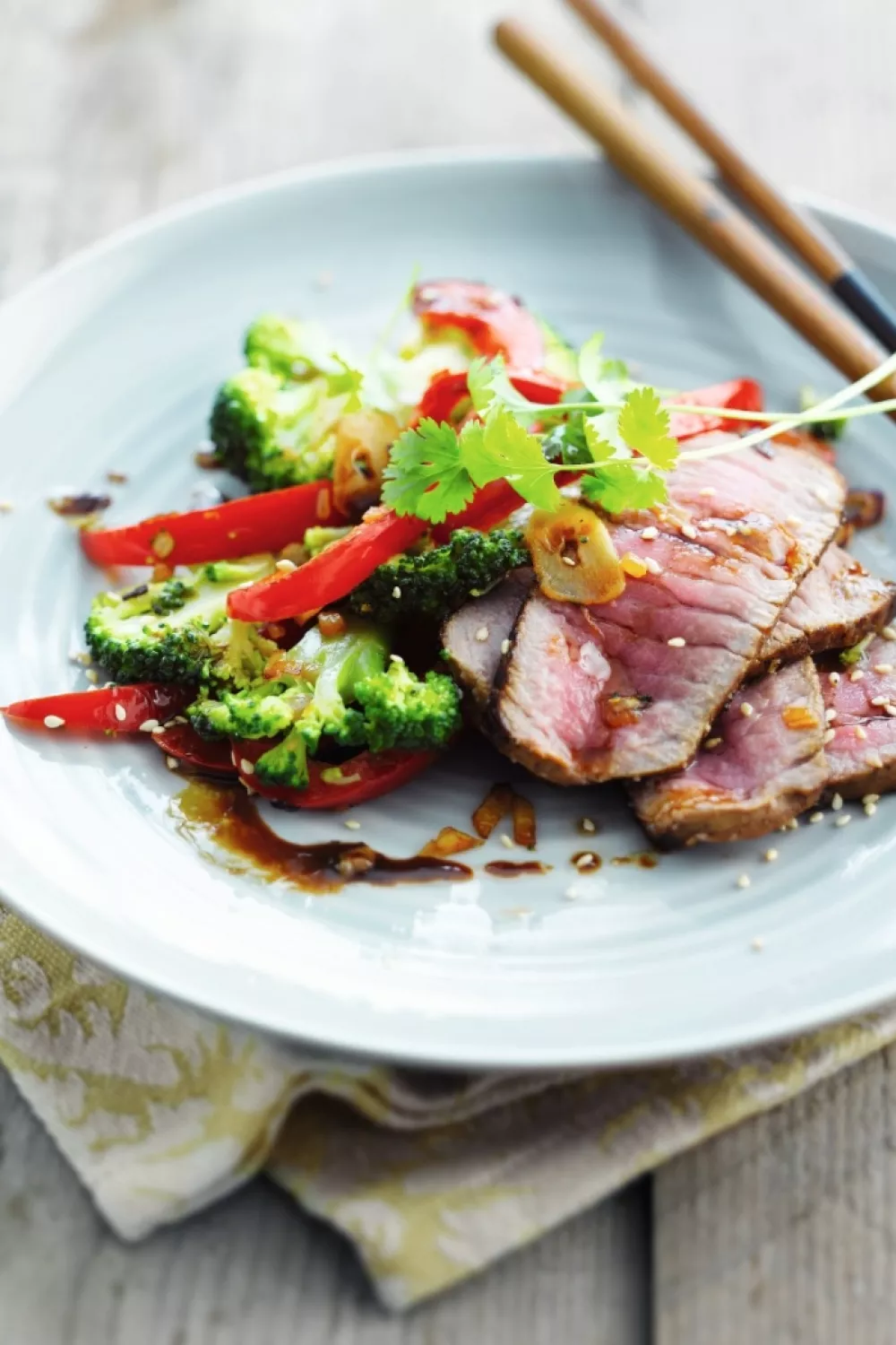 Snijd de rundfilet in sneetjes en serveer met de groenten. Strooi er het sesamzaad over.