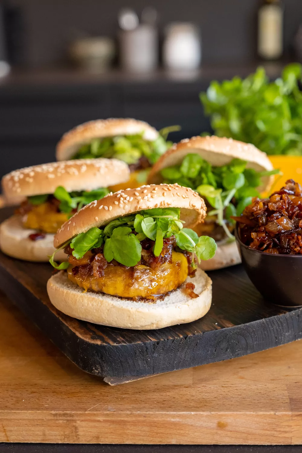 Deze robuuste rundsburger met zelfgemaakte spekconfituur van ontbijtspek, appel en ui combineert hartig bacon en zoete karameltonen tot een gezellige comfortburger voor weekenddiners of borrels. De spekconfituur wordt zachtjes gesudderd met cassonadesuiker en appelciderazijn, de burgers worden kort gebakken en onder een deksel met cheddarkaas laten smelten. Serveer op warme broodjes met een handje waterkers voor een smaakvolle herfstige touch.