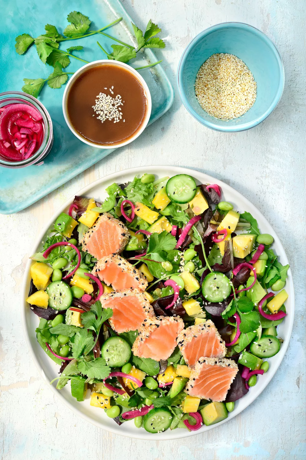 Een frisse Aziatisch geïnspireerde salade met knapperige sesamkorst en zacht tataki van zalm, afgewerkt met zoetzure ingelegde rode ui en een romige misodressing. Avocado, mango en edamame zorgen voor fruitige en groene accenten, perfect voor een lichte lunch of zomers diner. Snel aanbraden en kort koelen geeft een mals rosé centrum en veel umami.