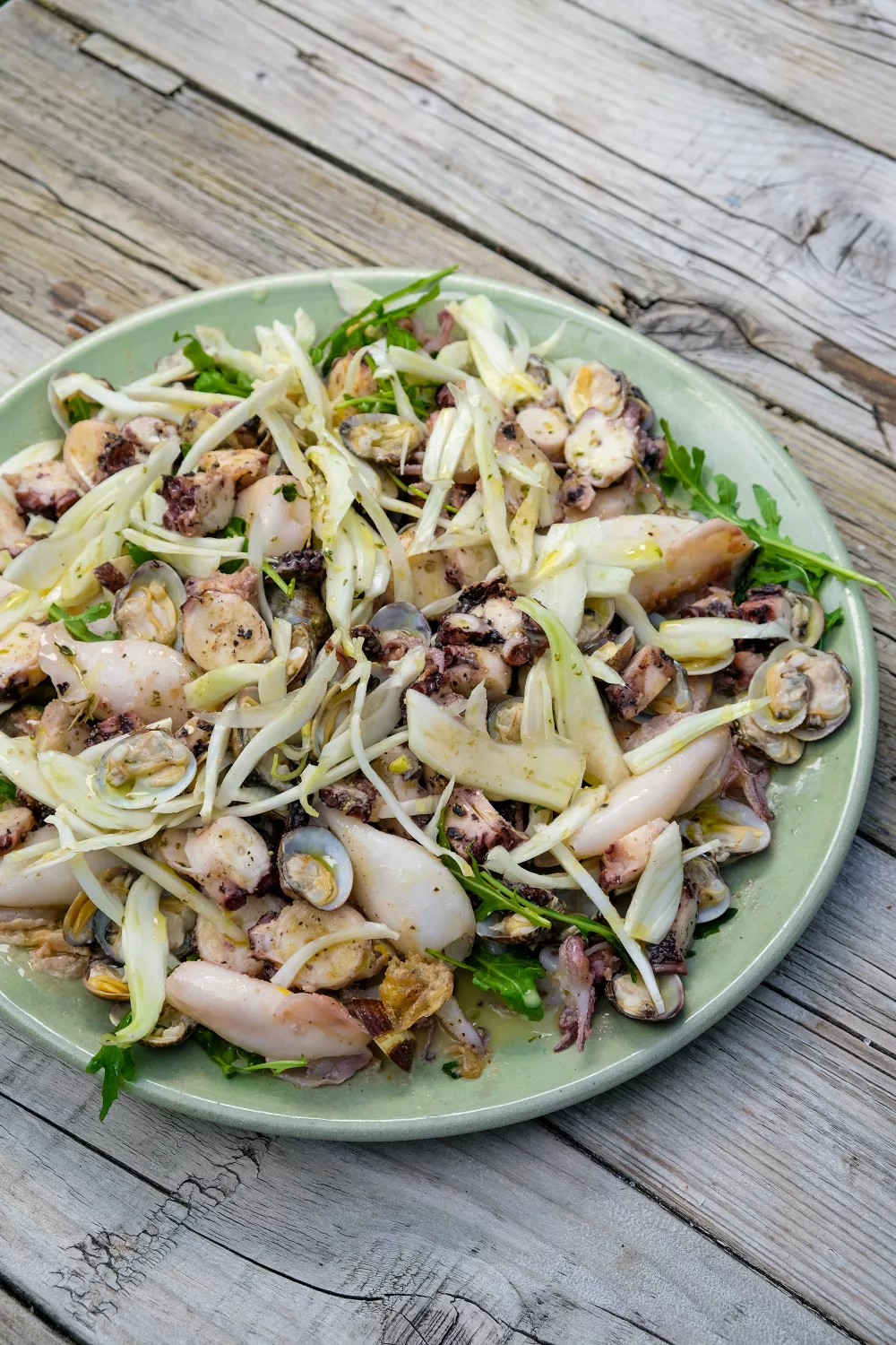 Frisse salade met zeevruchten en venkel waarin zacht geopende vongole, krokant gebakken inktvis en malse octopus samenkomen met knapperige venkel en pittige rucola voor een mediterraan palet van texturen en aroma’s. De schuimige dressing van vongolesap, olijfolie en witte balsamico geeft een zilte en frisse toets. Heerlijk als lichte zomerse maaltijd of feestelijk voorgerecht.