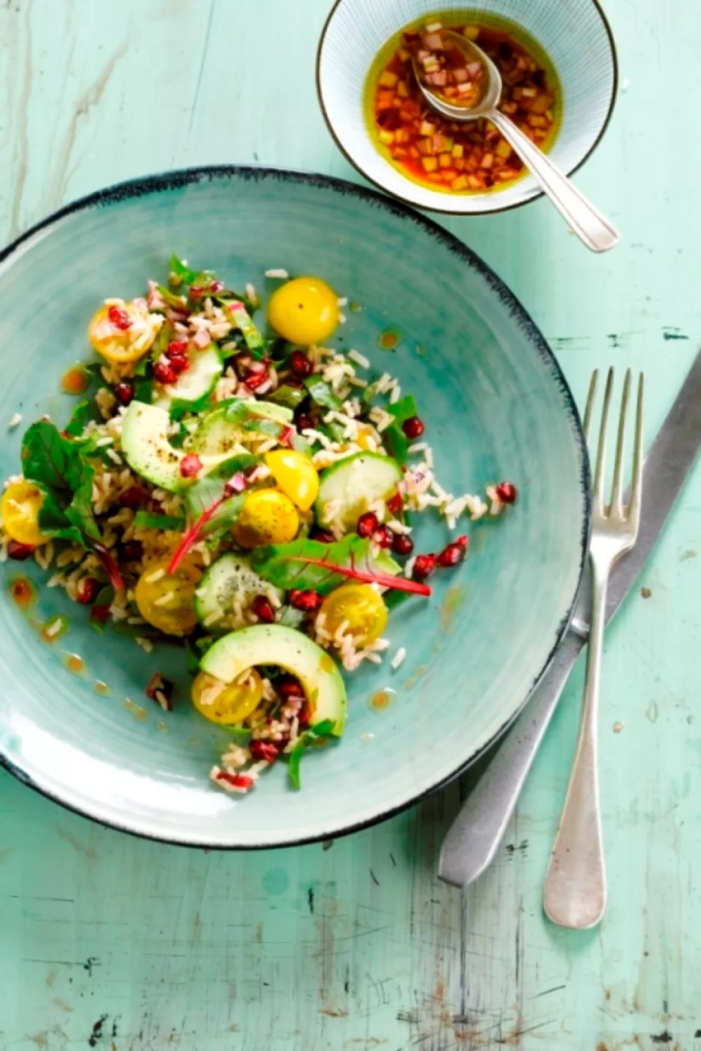 Deze kleurrijke salade van bruine rijst en granaatappel combineert hartige bietensla, romige avocado en knapperige noten tot een frisse lunch of feestelijk bijgerecht. Gekookte volle rijst geeft vulling, terwijl een dressing van mandarijn en granaatappel met een vleugje harissa de smaak opfrist. Perfect voor lichte maaltijden in elk seizoen en eenvoudig te maken door rijst te koken, groenten te snijden en de pitten uit de granaatappel te kloppen.