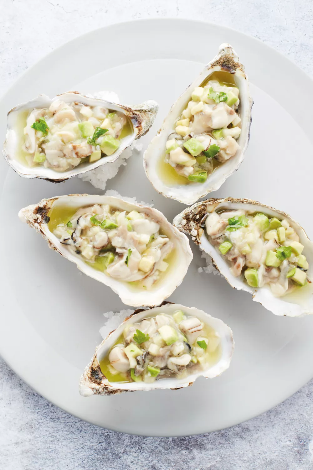 Reinig de schelpen en laat ze drogen. Versnipper de sjalot en snijd de korianderblaadjes fijn. Snijd een halve appel in een fijne brunoise, de avocado in kubusjes en de oesters in stukken en meng alles voorzichtig.