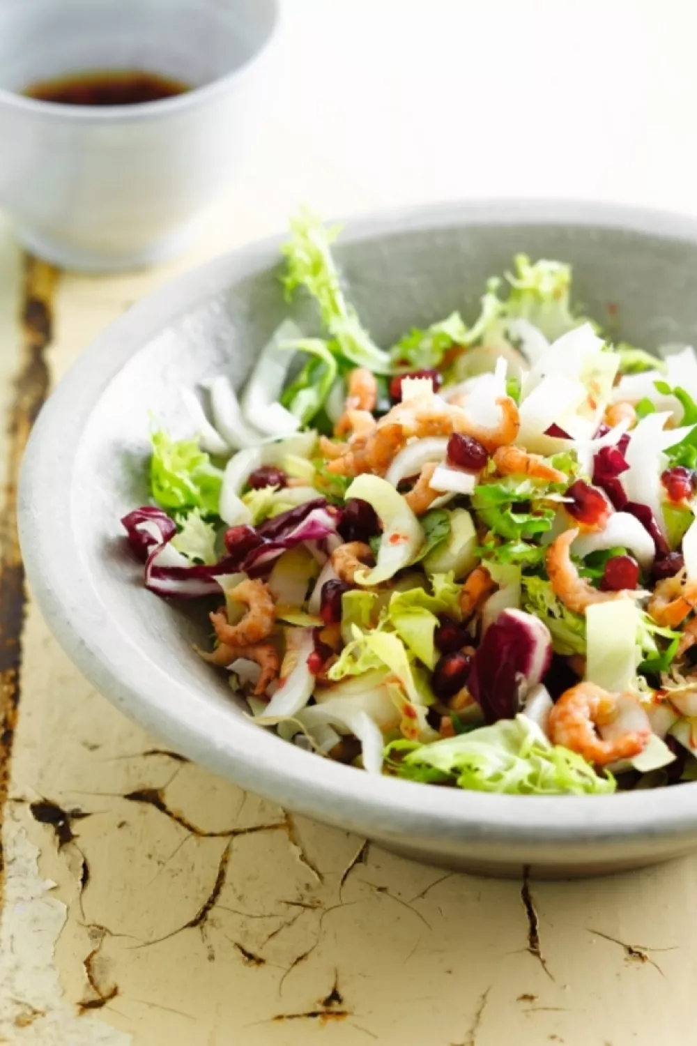 Een frisse salade witloof met grijze garnalen waarin knapperige witloofblaadjes samenkomen met zilte garnalen en sprankelende granaatappelpitjes, afgewerkt met frambozenazijn en olijfolie. De lichtzoete granaatappeldressing wordt snel gemengd terwijl je de witloofblaadjes loshaalt en fijn snijdt voor een fijne textuur. Perfect als lichte lunch, feestelijke starter of zomers aperitief, heerlijk met stokbrood.