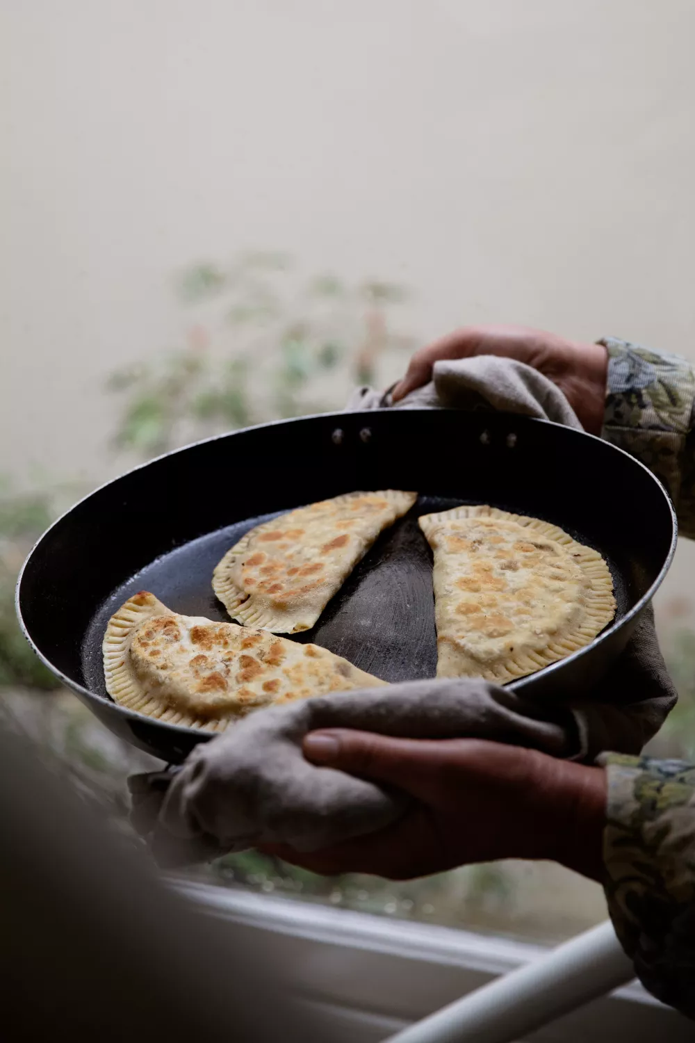 Bestuif je werkblad met een beetje bloem en verdeel het deeg in 17 bolletjes van gelijk formaat. Pak een bolletje en rol het plat en dun uit met een deegroller of met de palm van je hand tot je een cirkel hebt met een doorsnee van 18 cm. Verdeel 1½ eetlepel van het gehakt-uienmengsel over ruim de helft van de deegcirkel. Vouw de onderste helft van het deeg over de vulling heen zodat er een halvemaanvorm ontstaat. Druk de rand dicht met je vingers en daarna met de bolle kant van een vork zodat de afdrukken van de tanden erin staan. Herhaal met de rest van de deegbolletjes.