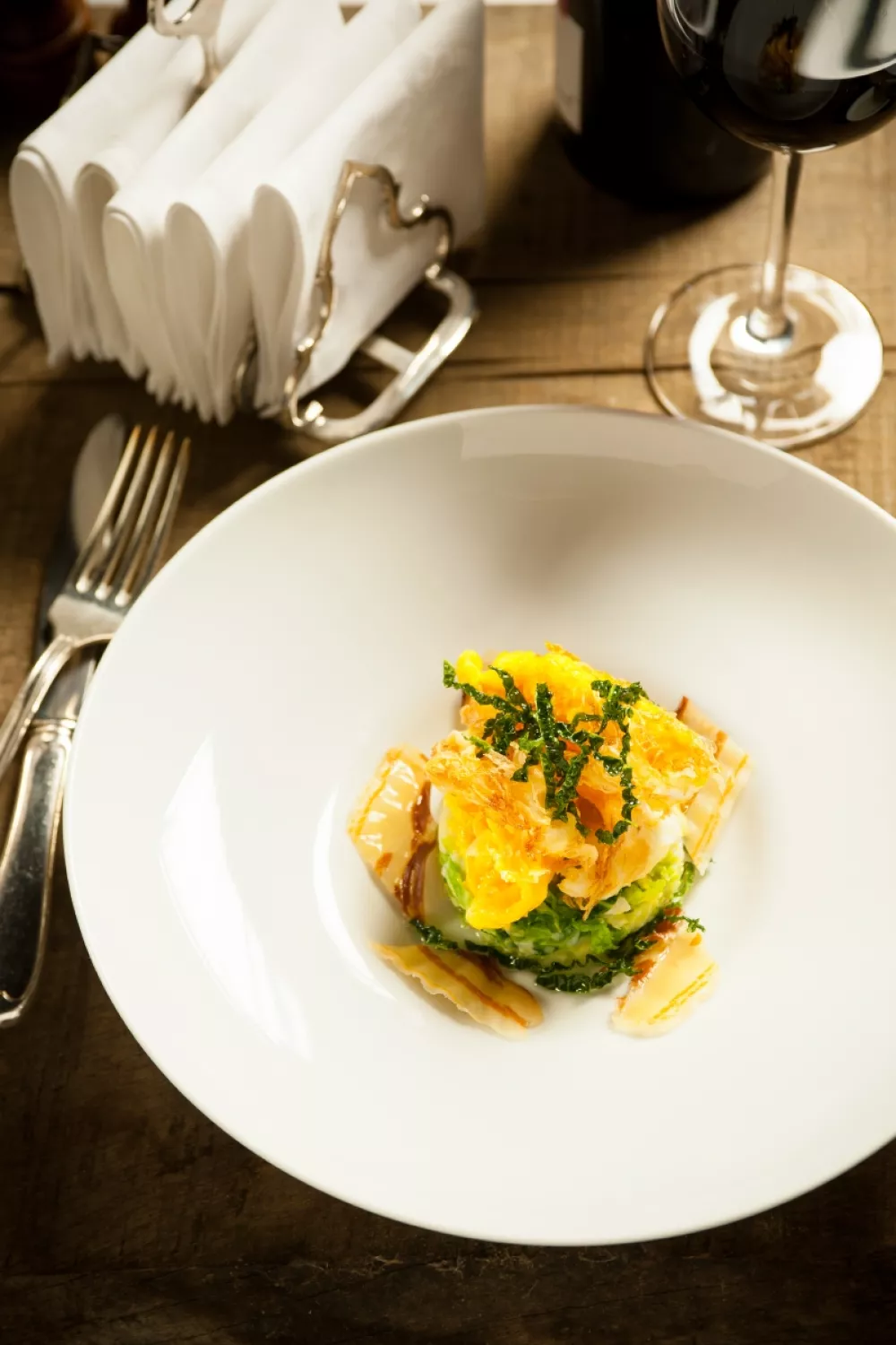 Neem een keukenring en leg die in het midden van een bord. Lepel daarin de savooistoemp en druk lichtjes aan. Verwijder de ring. Leg een gefrituurd ei op de stoemp, versier met wat gefrituurde savooireepjes en leg er de stukjes spek rond.