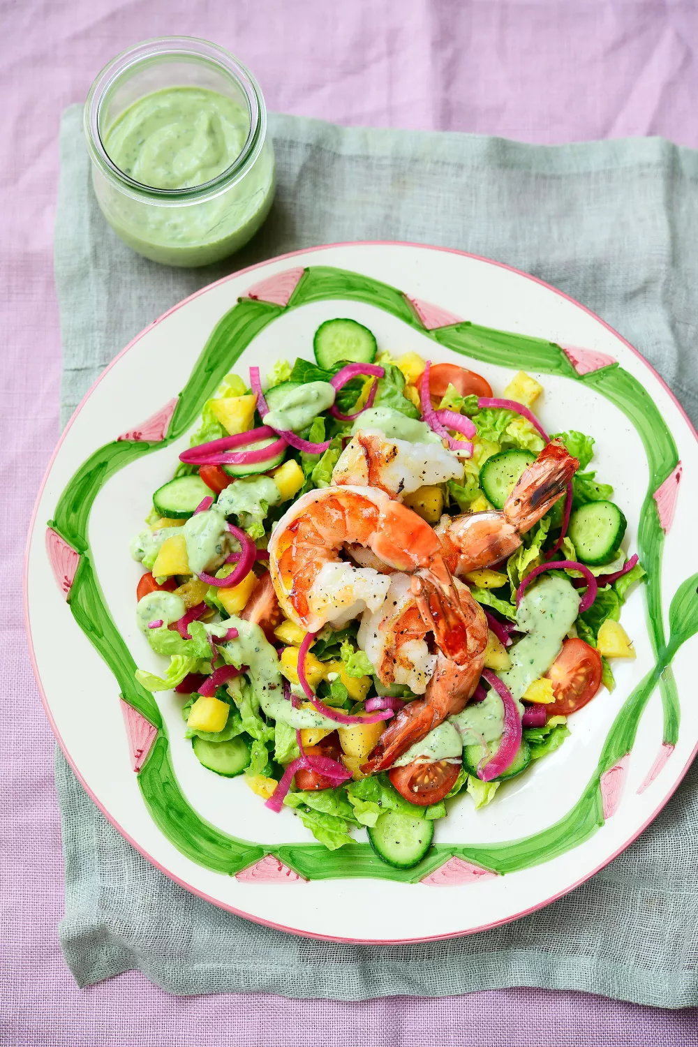 Deze scampisalade met ananas en avocadodressing is fris, licht en zit boordevol smaak. Zoete ananas en sappige kerstomaten combineren perfect met krokante Romeinse sla en frisse komkommer. De romige avocadodressing met limoen en koriander geeft een tropische toets die de scampi helemaal tot hun recht laat komen. Ideaal als zomerse lunch of voorgerecht.