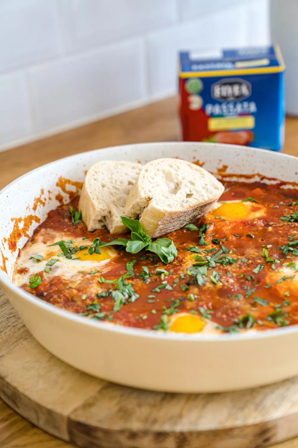Werk de shakshuka nog af met verse basilicum en serveer met sneetjes ciabatta.