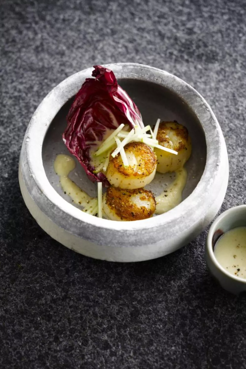 Neem een blaadje radicchio, napper daarop de saus enkele sint-jakobsvruchten. Werk af met versgemalen peper en fijngesneden appel.