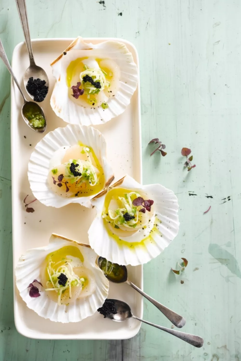 Schep één eetlepel zure room op een bordje of op een jakobsschelp. Schik de plakjes sint-jakobsvrucht erop. Schep er één eetlepel van de appel- en lente-uimengeling op en werk af met een mespuntje viseitjes, een toefje cress en versgemalen citroenpeper.