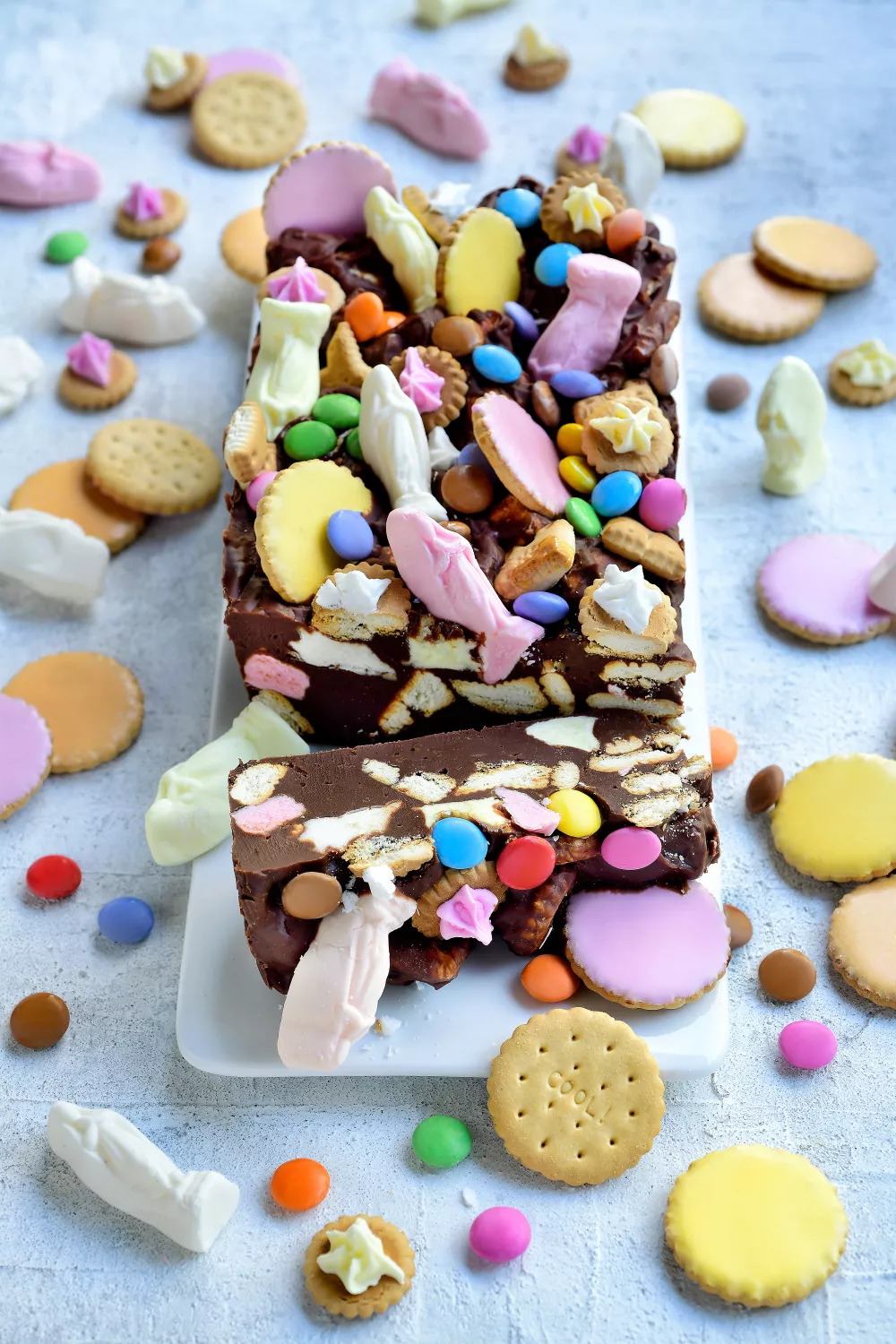 Werk de bovenkant af met het overige snoepgoed en de smarties. Laat minstens vier uur opstijven in de koelkast alvorens in plakken te snijden en te serveren.