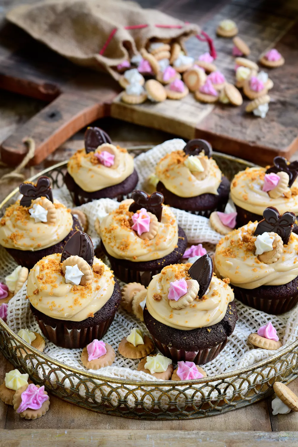 Werk de cupcakes nog af met chocolade, snoepgoed en speculaaskruimels alvorens te serveren.