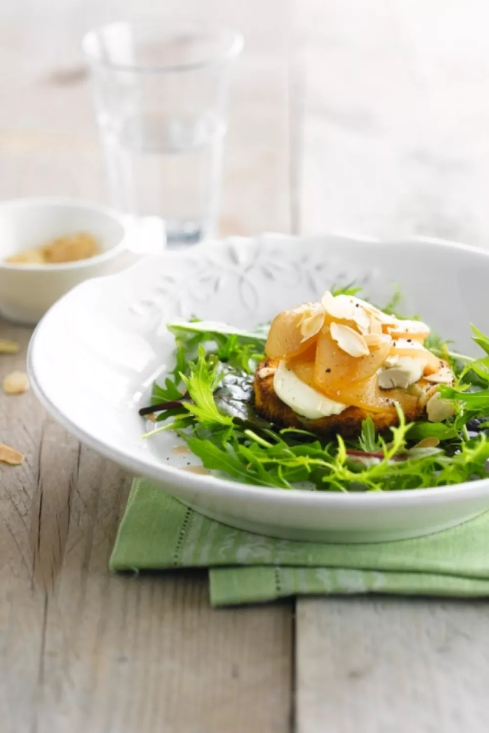 Een warm herfstig slaatje met romige geitenkaas en licht gekaramelliseerde peren, afgewerkt met Luikse siroop voor een rijke zoetheid. Op knapperig geroosterd krentenbrood en bestrooid met geroosterde amandelschilfers is dit ideaal als lunch of verfijnd aperitief voor koude dagen. Snel te bereiden door bakken, karamelliseren en kort grillen, en een fijne mix van zoet, zout en krokant op het bord.