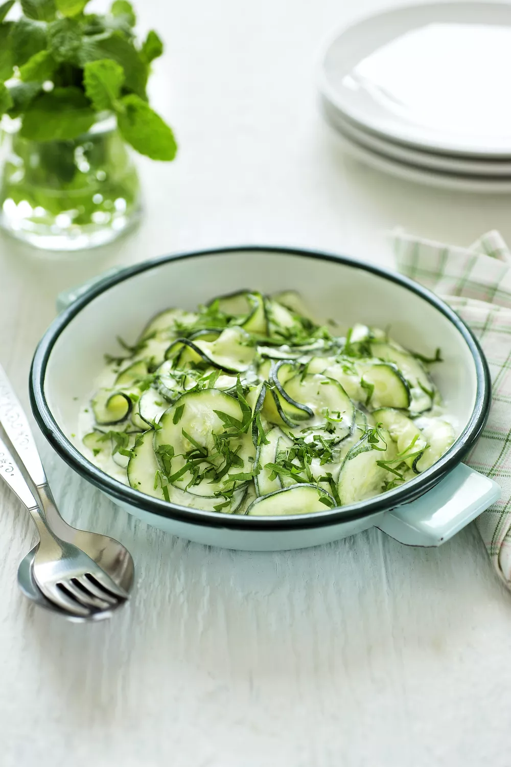 Neem een mandoline en snijd de courgette superfijn. Voeg peper, zout en room of kokosmelk toe. Voeg de fijngesneden kruiden toe en meng ze onder het slaatje.