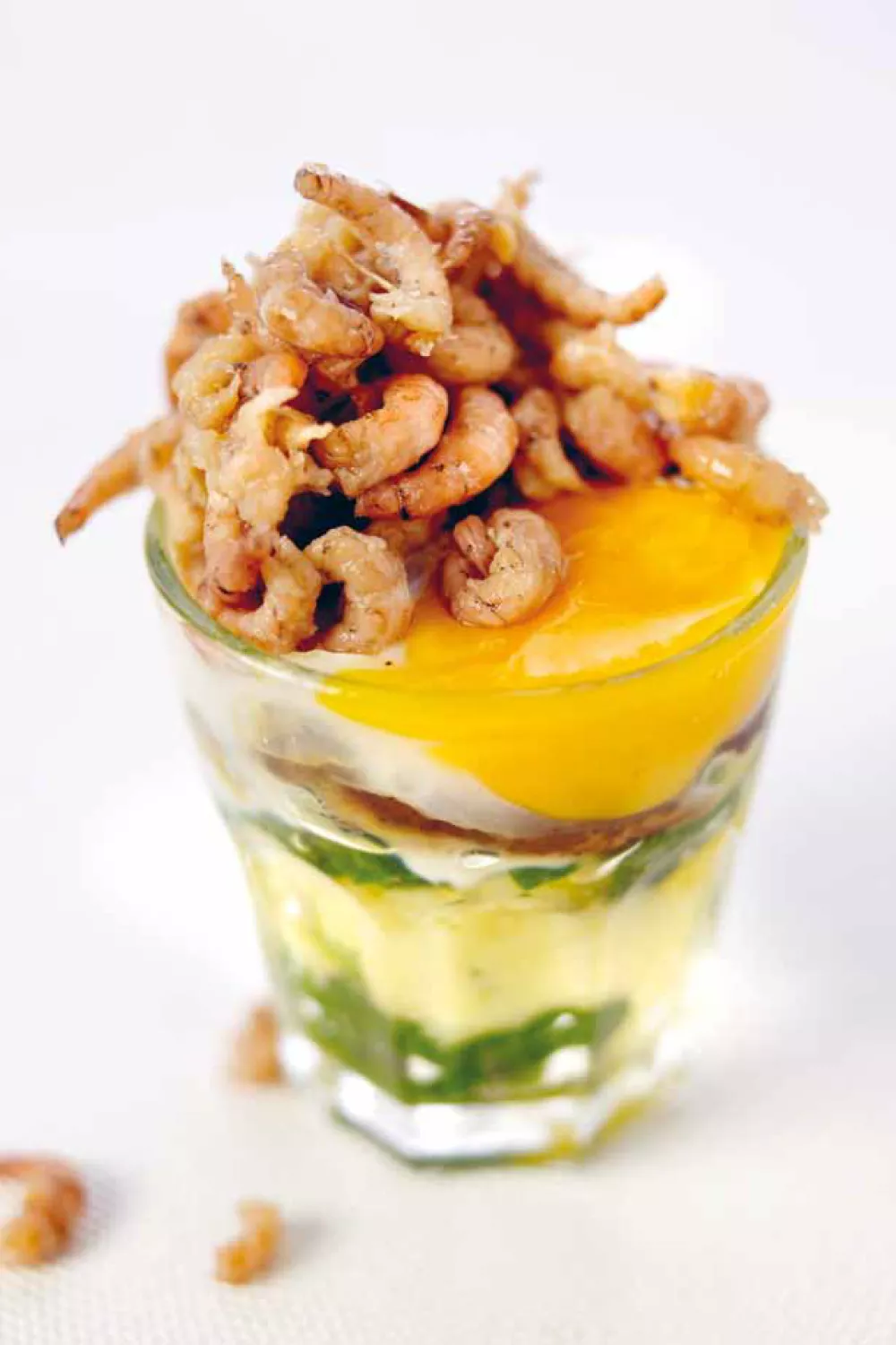 Doe nu de spinaziestoemp in een glas en leg er enkele shiitakes bovenop. Breek een scharrelei en giet het rauwe ei over de shiitakes. Zet het glas een minuut in de microgolfoven op 900 watt. Het eitje wordt dan baveuse. Dat betekent dat het bijna helemaal gaar is, maar toch nog sappig. Werk af met een handjevol grijze garnalen.
