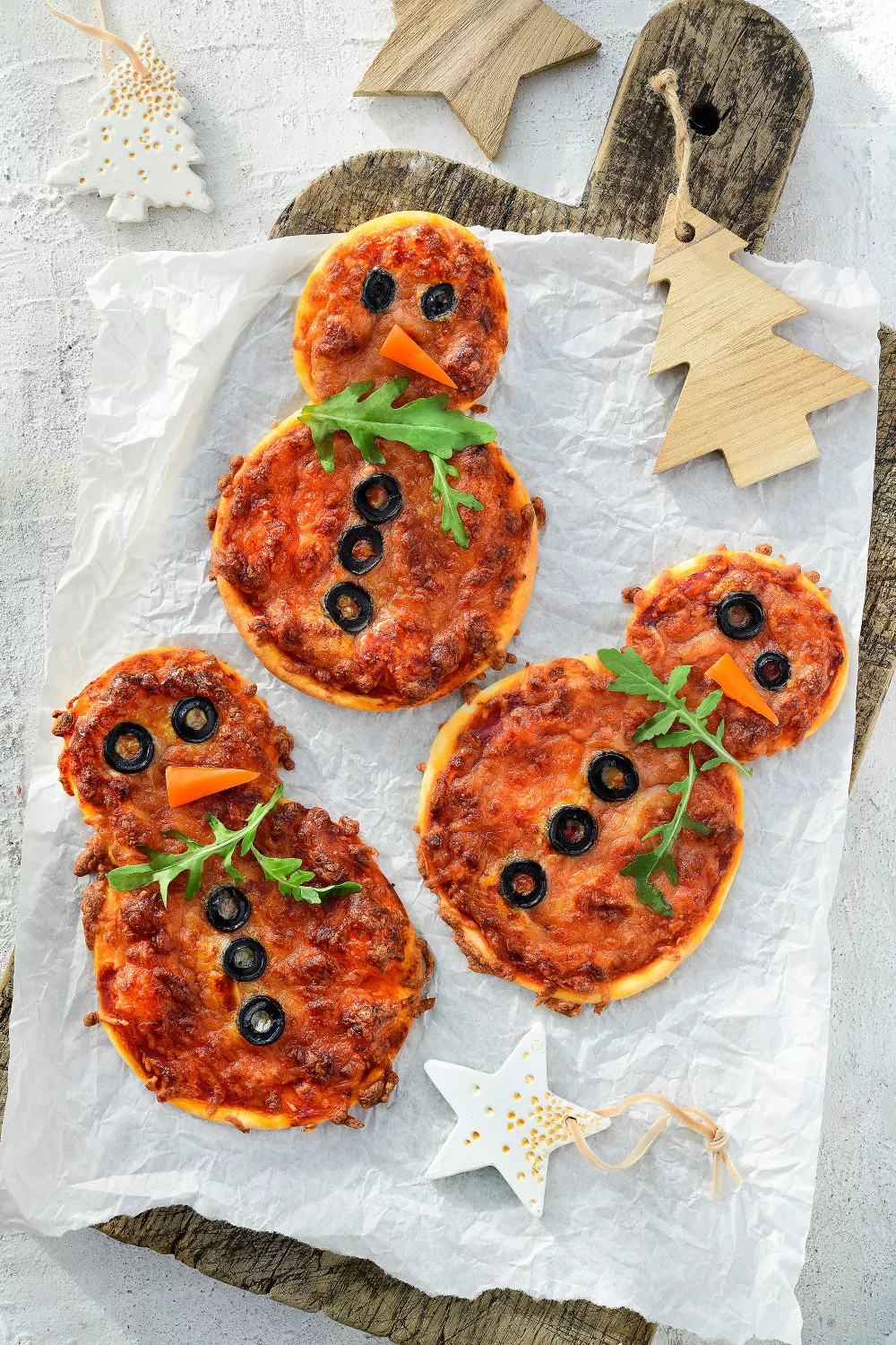 Vrolijke sneeuwmanpizza's van krokant pizzadeeg, romige passata en gesmolten mozzarella zijn een feestelijke snack voor winterse borrels of kinderfeestjes. Met zwarte olijfjes als ogen, oranje paprika als neus en een rucola sjaal bak je in de oven in een mum van tijd drie schattige pizzaatjes. Makkelijk en vegetarisch, ideaal als kersthapje of gezellig weekendproject met de kinderen.