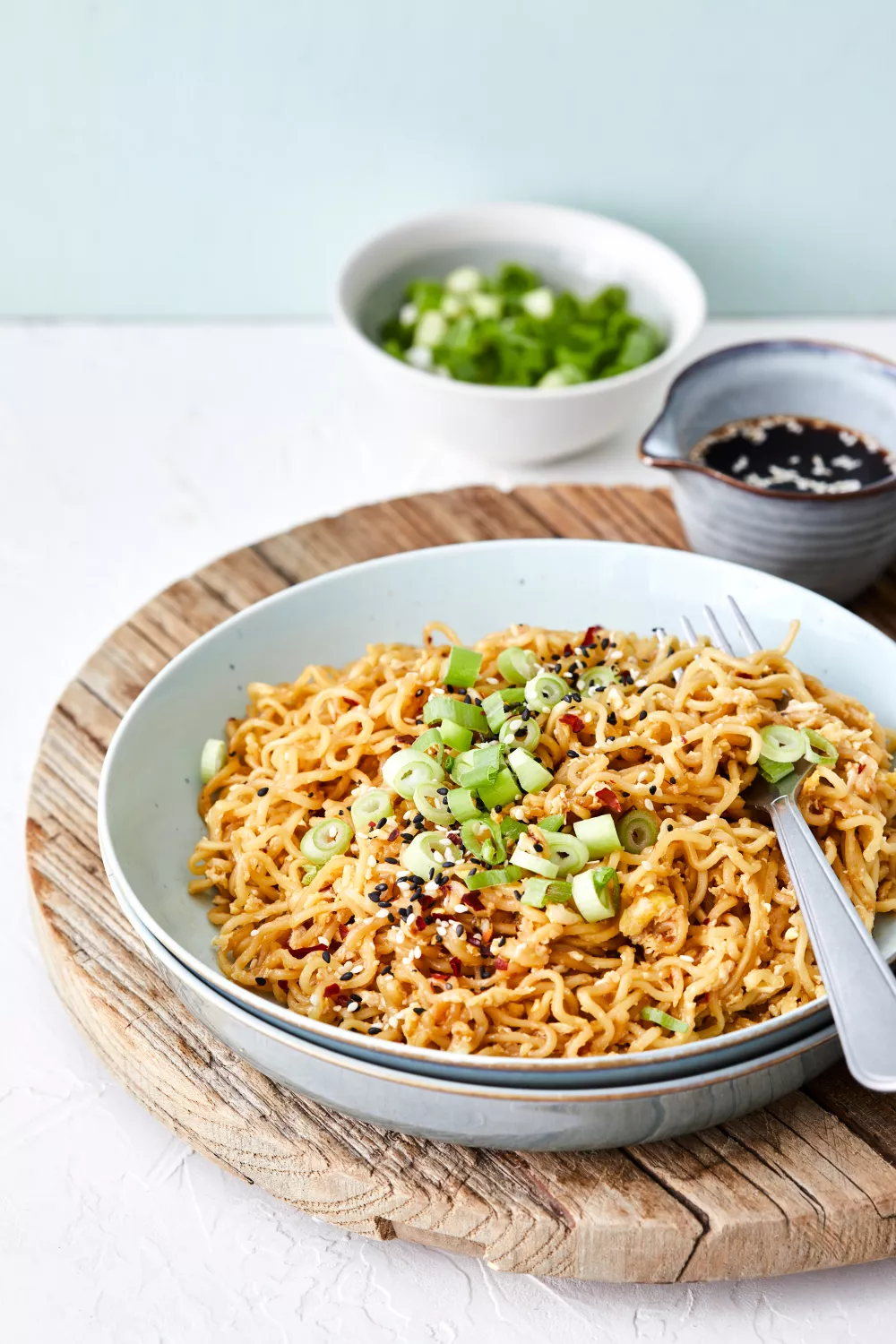 Schep de noedels in een bord en verdeel er de fijngehakte lente-ui over. Werk af met extra chili flakes en sesamzaadjes.