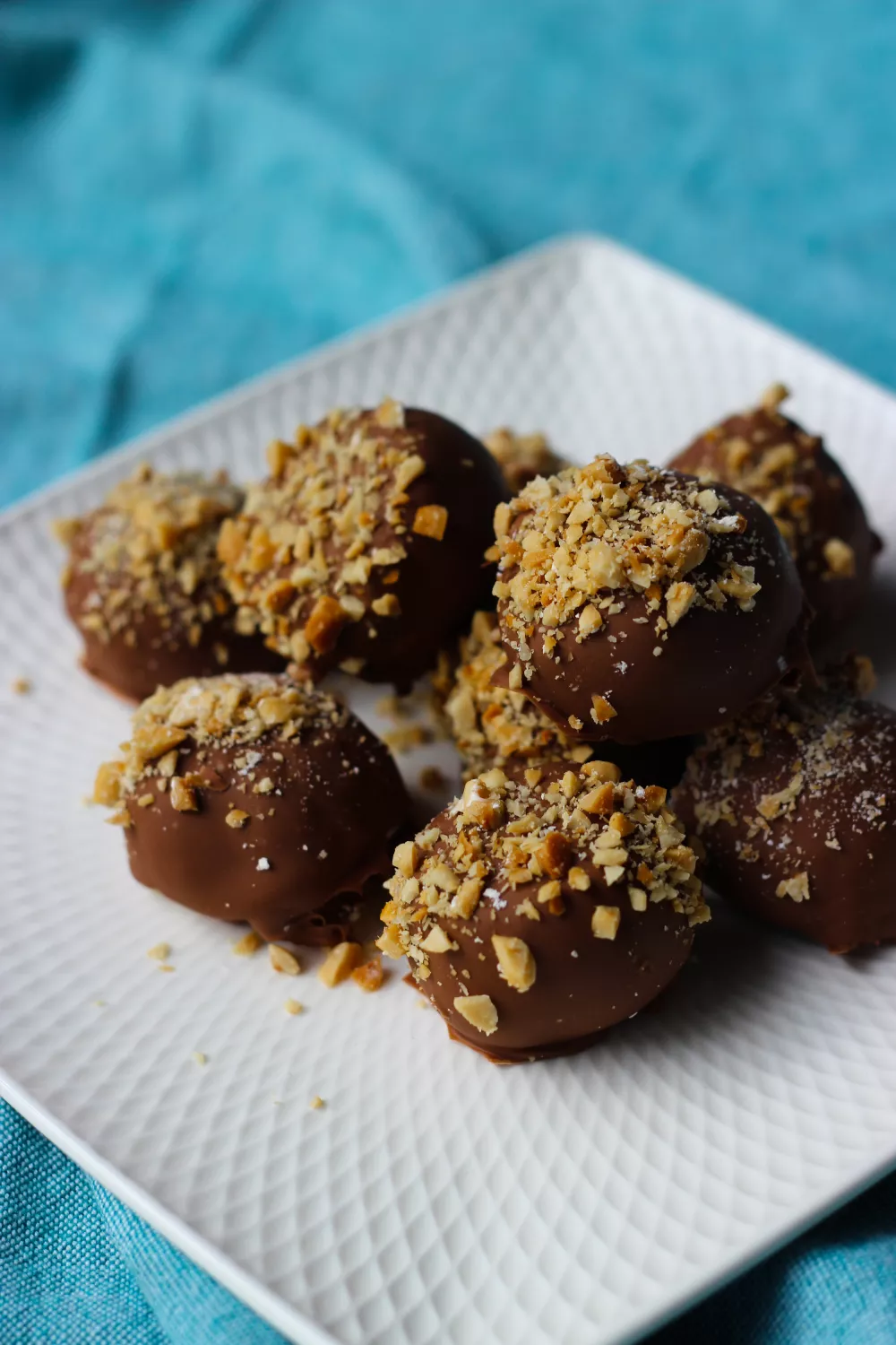 Smelt ondertussen de chocolade en vul een kommetje met maïzena en een kommetje met de rest van de fijngehakte pindanoten.