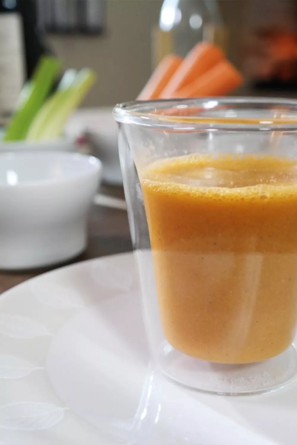 Verwarm de soep nog even opnieuw op het vuur en schenk ze in glaasjes.