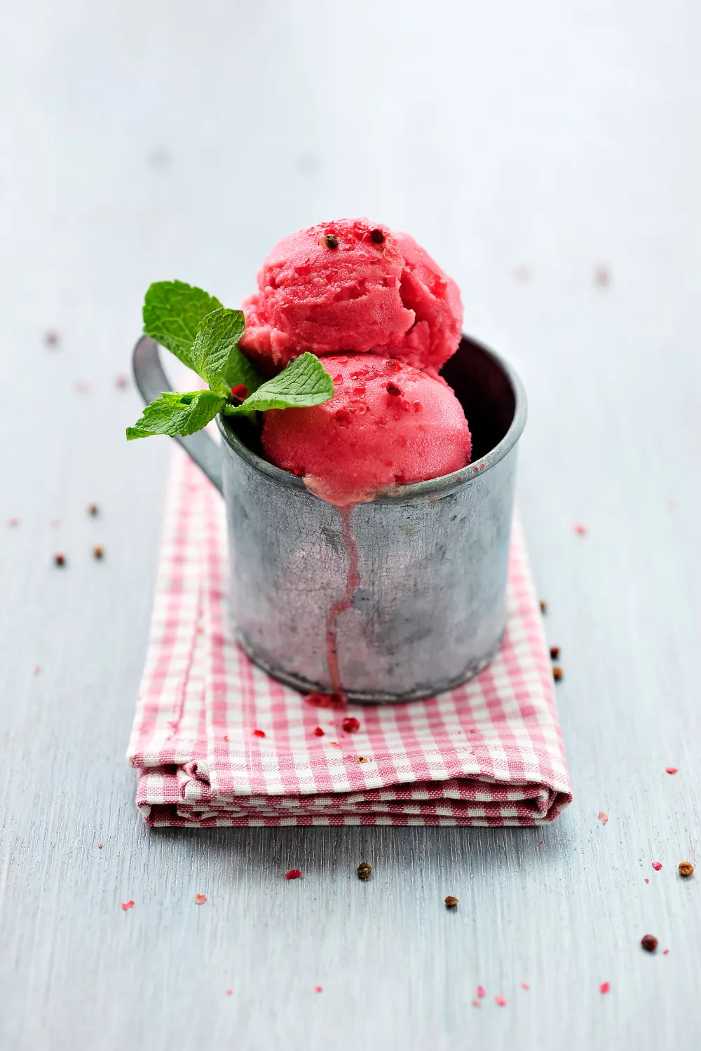 Serveer de sorbet in leuke kopjes, werk af met een blaadje munt en wat geplette roze peperbolletjes.