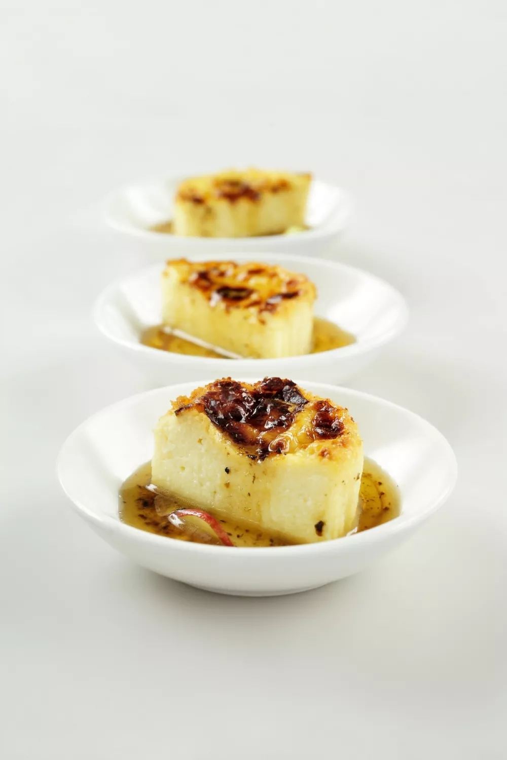 Een luchtige hartige soufflé met romige Taleggio en een krokant plakje appel, afgewerkt met een royale toets honing voor een verrassende zoet-zoute balans. Door de room en eidooiers blijft het interieur fluweelzacht, terwijl geraspte Parmezaan en kort bakken in een waterbad zorgen voor diepe smaak en perfecte textuur. Perfect als verfijnde amuse of feestelijk voorgerecht bij een gezellig diner in de herfst of winter.