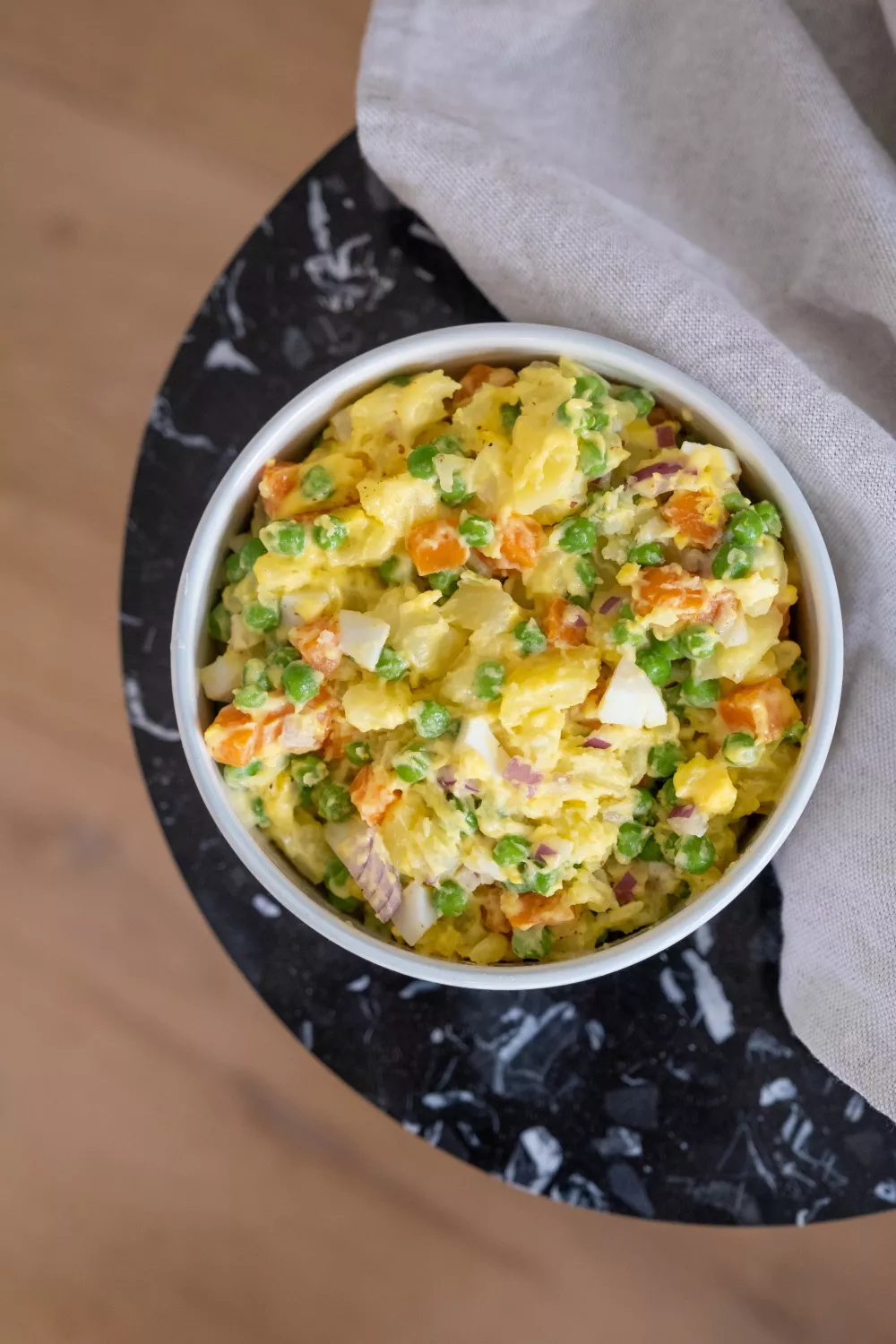 Knapperige groenten en romige huisgemaakte mayonaise geven deze Spaanse aardappelsalade een frisse, zomerse toets waarbij zachte aardappelblokjes, zoete wortel, erwtjes en stukjes ei samenkomen. De salade maak je snel klaar door de aardappelen te stomen, wortels en erwtjes kort te koken en de mayonaise met citroen en mosterd te mixen. Ideaal als kleurrijk bijgerecht bij tapas, barbecue of een picknick.