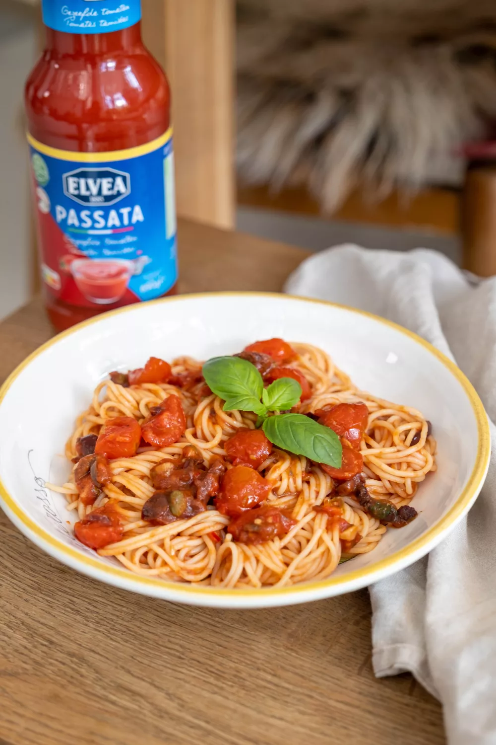 Spaghetti alla puttanesca brengt pittige, hartige smaken van ansjovis, zwarte olijven en kappertjes samen in een simpele tomatensaus. Met knoflook, chili en passata zet je in korte tijd een mediterraan pastagerecht op tafel dat al dente gekookte spaghetti krijgt en even laat sudderen zodat de smaken intrekken. Perfect voor een snelle doordeweekse maaltijd of een zomers familie-etentje.