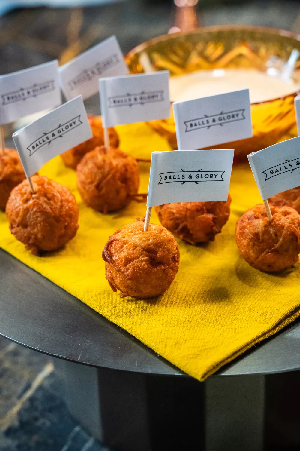 Frituur de balletjes goudbruin in de friteuse op 180°C, laat ze even uitlekken op een keukenpapietje en serveer met de dipsaus.